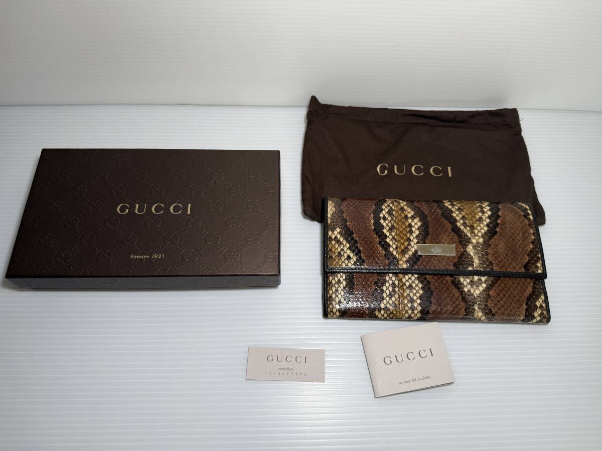 【送料込】GUCCI グッチ 長財布 三つ折り パイソン ロゴプレート ゴールド金具 レザー ブラウン 茶 メンズ エキゾチック ウォレットwallet