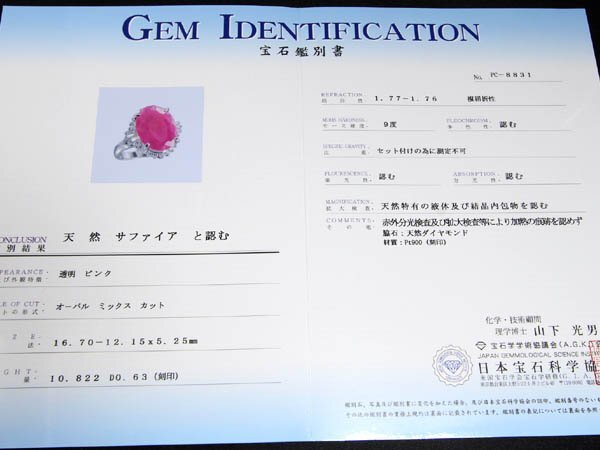 ◆安心の品質!!!【日本宝石科学協会】発行 宝石鑑別書&非加熱分析報告書付き!!! !!! 圧倒的存在感!!! 天然非加熱ピンクサファイア 特大10.822ct&極上ダイヤモンド 総計0.63ctを贅沢に宝飾した、超高級リングをご紹介いたします!!! こちらは1石でなんと10.822ctと希少サイズの天然非加熱ピンクサファイア!!! 市場に出回るコランダムの90%以上が加熱処理を施されたお石の為、10.822ctもの特大サイズの天然非加熱ピンクサファイアは、大変魅力的なお品でございます!!! 天然非加熱ピンクサファイアの華やかな濃厚カラーの輝きと、特大10ctオーバーの圧倒的な存在感を、是非お手元でご堪能くださいませ!!! 周囲には透明感溢れる輝きを放つ極上ダイヤモンドを、総計0.63ct贅沢に宝飾!!! 極上ダイヤの輝きが、特大非加熱ピンクサファイアを引き立てています!!! 繊細に創り込まれたエレガントなデザインには、高級素材Pt900を使用!!! プラチナの質感が、より一層の高級感を演出します!!! こちら格安での出品となっておりますので、この機会是非お見逃しなく!!! ◆こちらの商品はお客様の希望がある場合のみ、評価をつけております。 評価希望のお客様は、オーダーフォームの要望欄にてお知らせくださいませ。 ◆サファイアには、天然のインクルージョンからなるカン・カケがございます。 |
