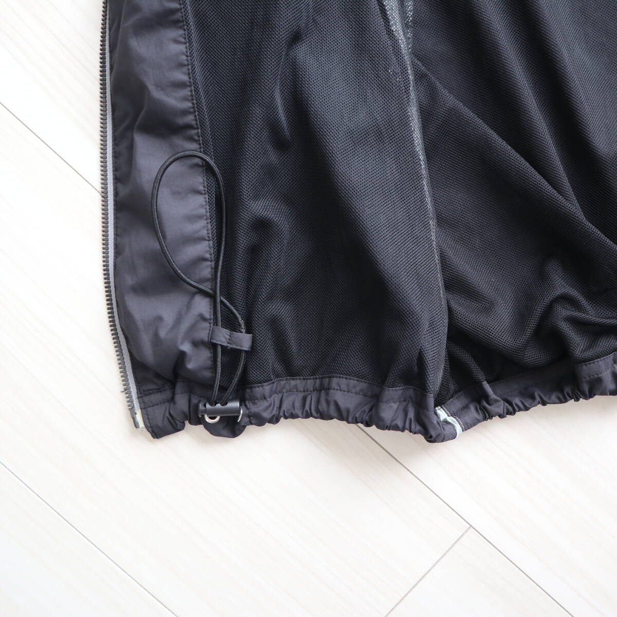 生地の表面にアクリル素材でコーティング加工を施してあるため、撥水性にすぐれ、水滴がビーズ状になって転がり落ちます。モックネック(一部リブ地)、フロントフルジップ、脇下にホールベンチレーション、左右ポケット、裏側はメッシュ裏地付き、裾にゴム製ドローコード付き、レイヤードスタイルでアウターとしても着用いただけます。小雨程度であれば水をはじいて快適なプレーが可能!