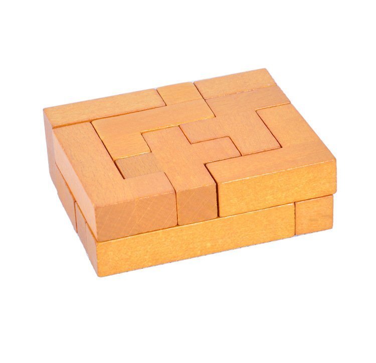 いろいろ形をした13個のピースを組み合わせる木製パズル。