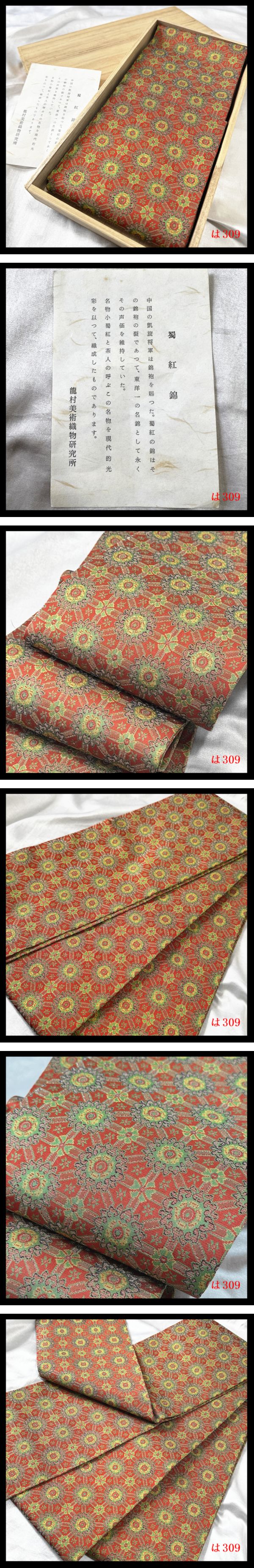 蜀紅錦とは、中国蜀の国(二二一~二六三)の首都であった成都で製作された錦をいいますが、蜀の地で製産される蜀錦は三国時代以前からすでに有名でありました。奈良の法隆寺に、重要文化財に指定されている、蜀紅錦と呼ばれるものが二種類伝えられていますが、いずれも紅地で、一つは格子の中に花模様を出したもの、一つは幾何学文様で、共にこの錦の文様とは全く趣を異にしています。蜀紅錦がこの錦のような柄構成になったのは南宋時代(一一二七~一二七九)以後といわれ、その後、蜀紅錦と呼ばれる錦には、このような文様型式が定着しています。 この製品は、前田家に伝えられている名物裂の中の元末明初の頃と思われる蜀紅錦を模し、色調に工夫をして、経錦として織り出したものです。