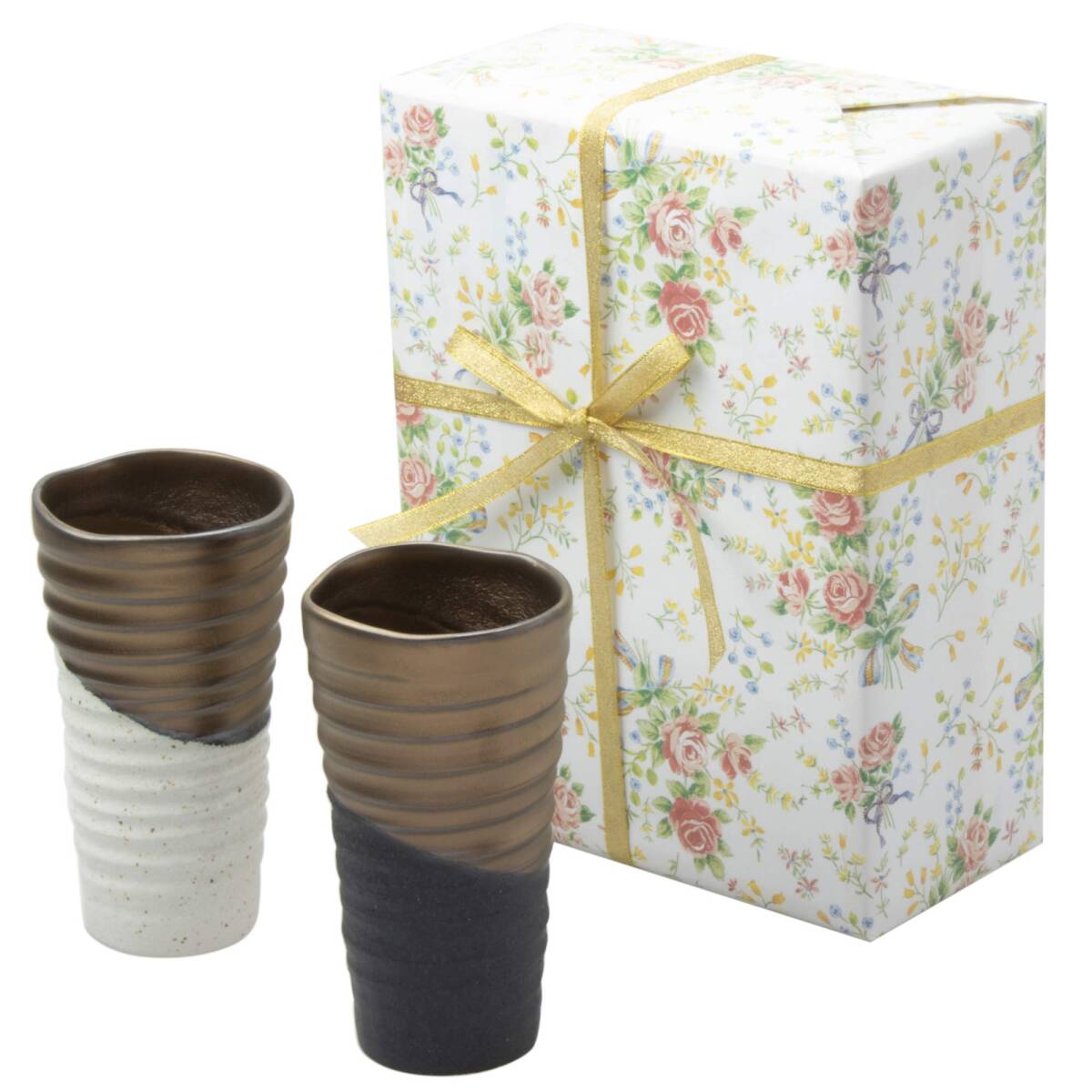ギフトにおすすめ。包装仕様ローズ柄の包装紙と金色のリボンラッピングでお届けします。重厚な輝きが特徴のペアカップ。煌き ペア晩酌カップ(木箱入)/包装紙ローズおすすめギフトシーン:結婚お祝い、結婚内祝い、各種お祝い・内祝い、お礼、プレゼントなど