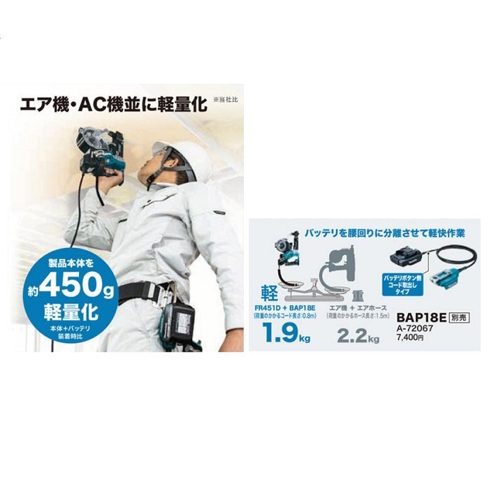 製品本体をバッテリ装着時に比べて約450g軽量化でき、軽快に上向き作業ができます。
