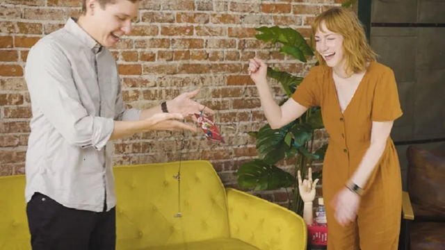 2人の観客に紐の両端を持って引っ張ってもらいます。
