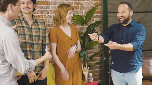 大勢の観客の前で演じられる落ちて当てるポストカードマジックです!