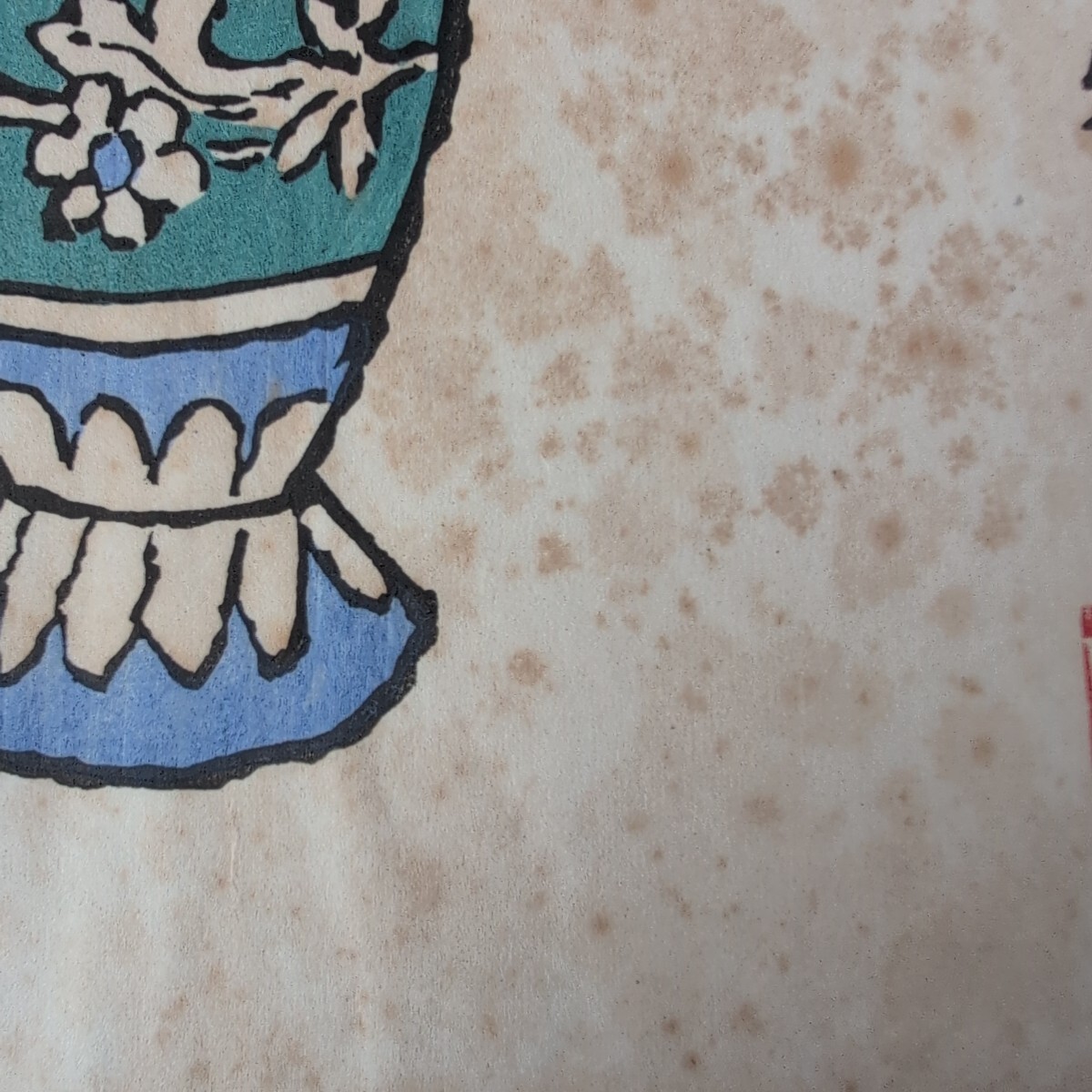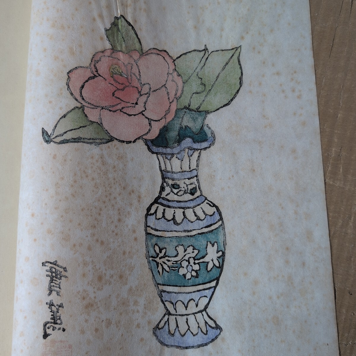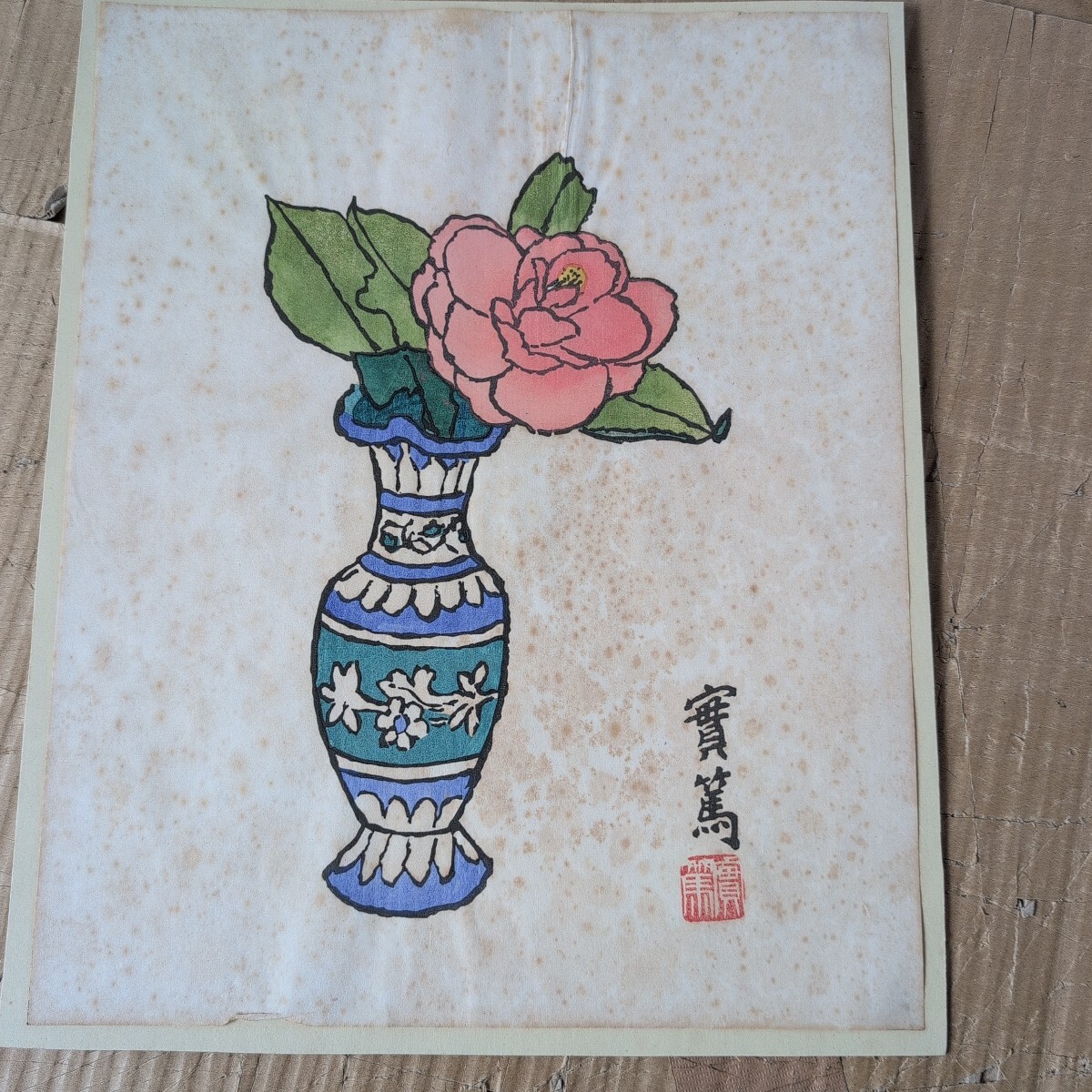 武者小路実篤の花瓶です。木版画と思われますが判りません。縦33cm×横27cm。全体的にシミ汚れが見られます。鑑定書はございませんので模写として出品いたします。父親のコレクションですので詳しい事は判りません。写真で判断、お願いします。返品及び返金には対応しませんので熟慮の上、入札してください。新規(取引履歴のない)方、一定以上の悪い評価が付いてる方の入札及び落札をこちらの判断で取り消す場合がございますのでご理解ください。