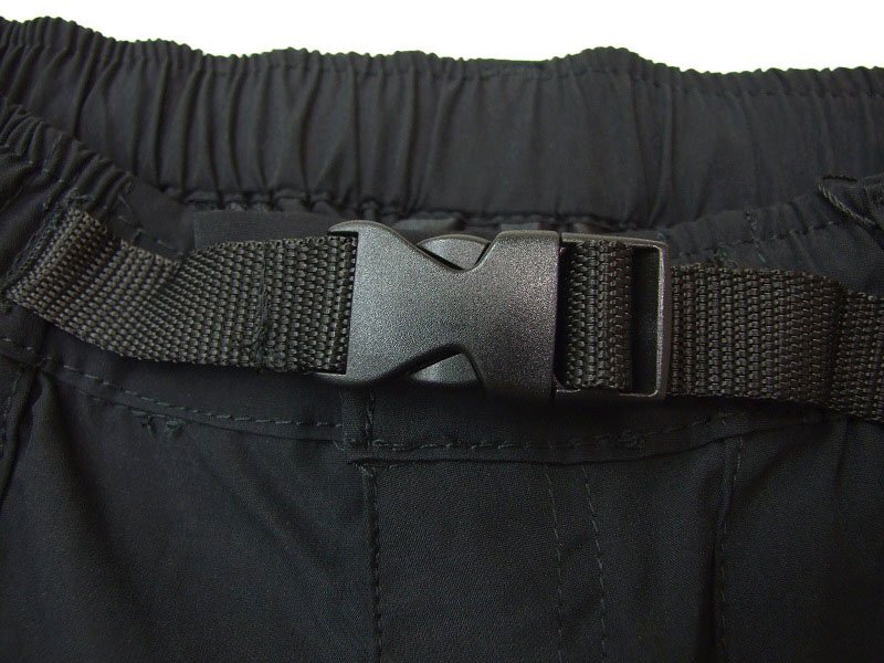フロント開閉はジップ式。ウエストはサイズ調節可能なウェビングベルト、ゴムで伸縮する機能性に長けたディテール。