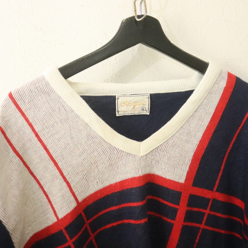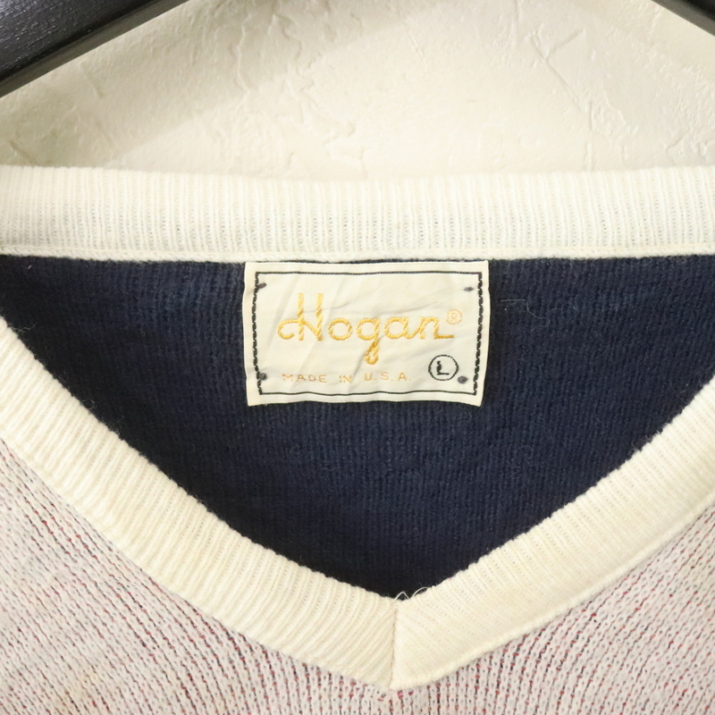 a895 80sビンテージ Hogan アクリルニットセーター USA製■1980年代製 表記Lサイズ ネイビー 紺 Vネック 柄 アメカジ ストリート 古着 激安