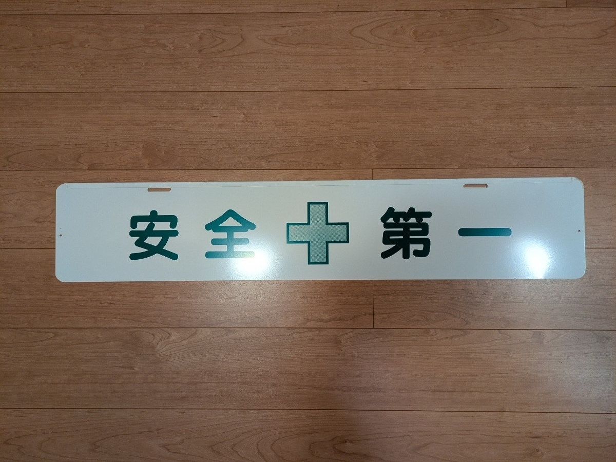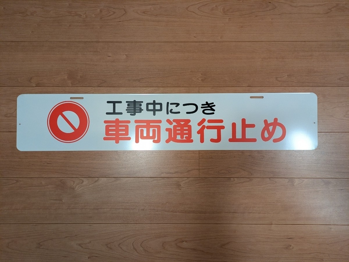 スチール製の「工事中につき車両通行止め」標識です。サイズは縦約20センチ横約100センチです。A型バリケードに取り付けられる穴も空いています。様々な使い方ができると思います。裏面は無反射の「安全第一」になっています。未使用ですが保管に伴うキズ・擦れ等はご了承下さい。3Nでお願いします。