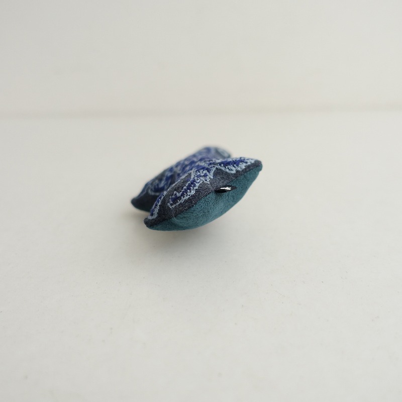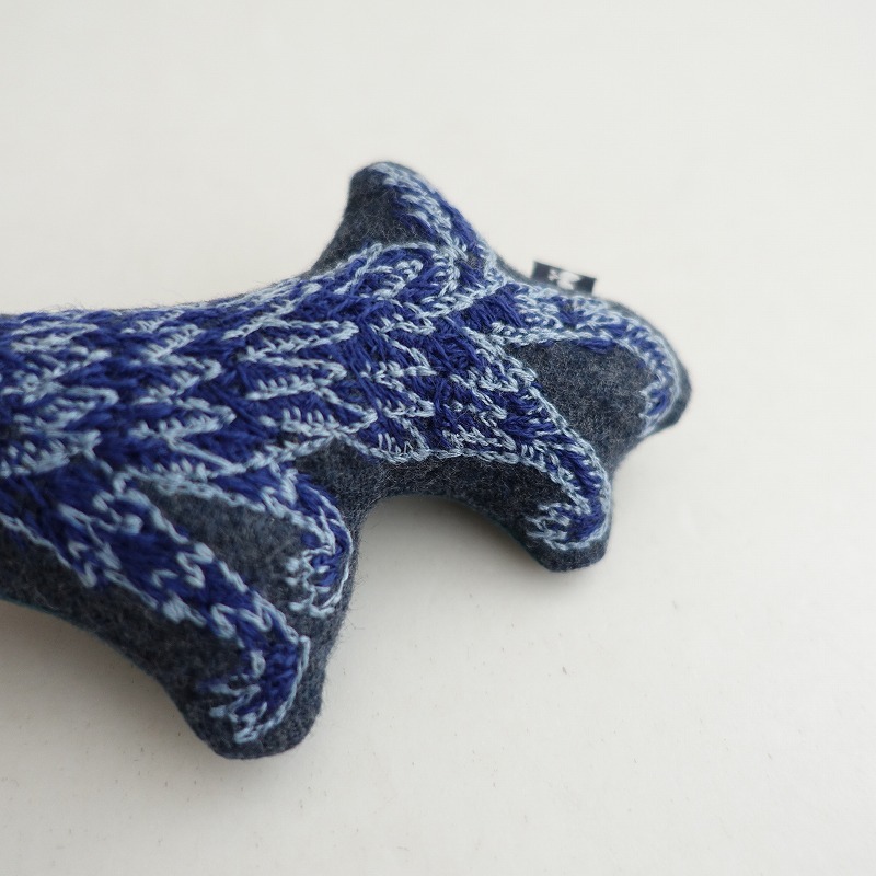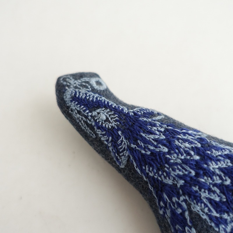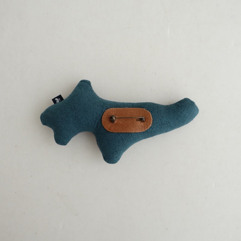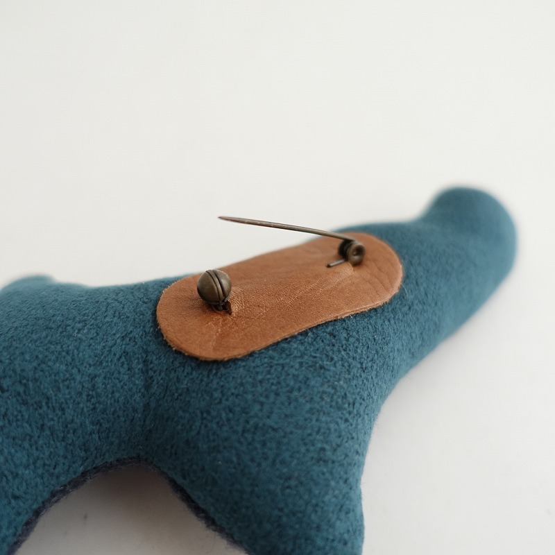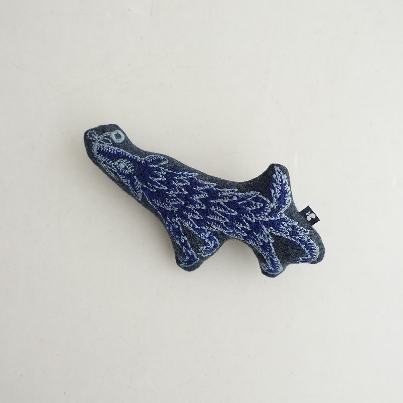 | mina perhonenのwolf&flower ブローチです。 カラーはグレーベースにネイビー・ライトブルーで「wolf&flower」のテキスタイル刺しゅうが施されております。 裏側はくすみグリーンに切り替えられております。 |