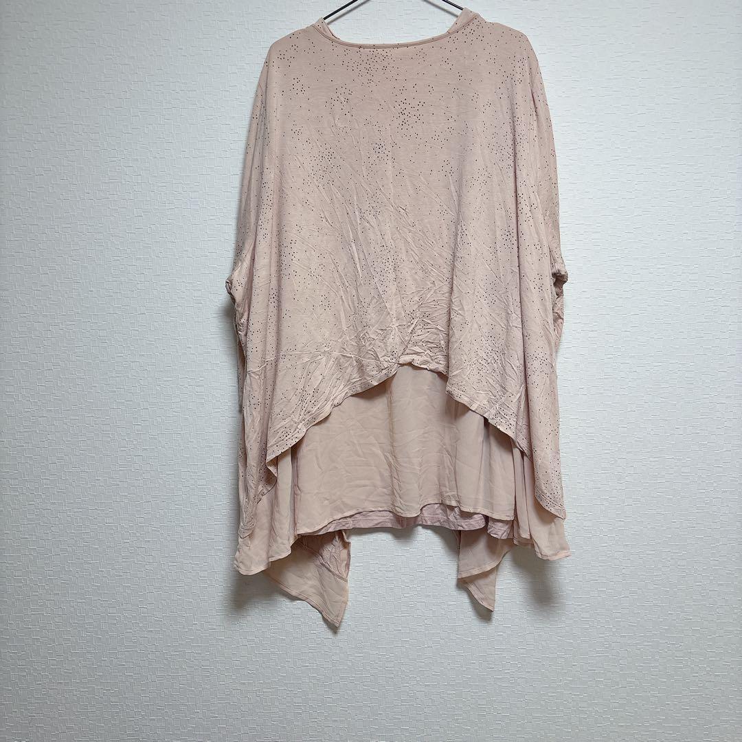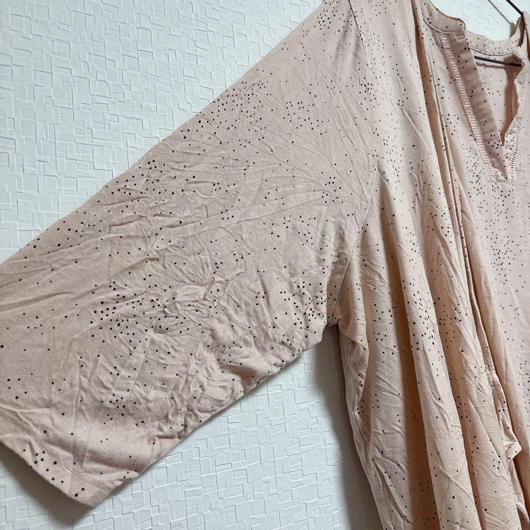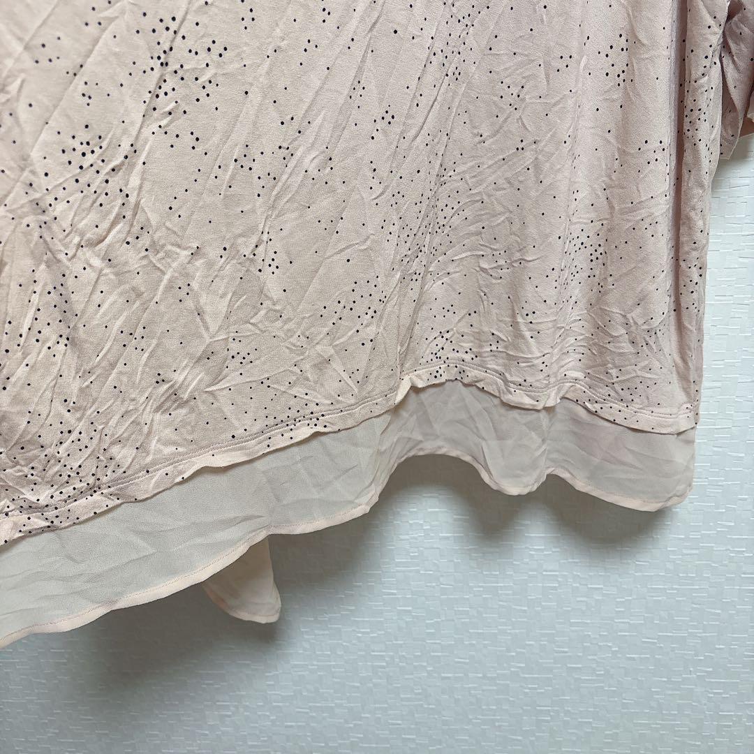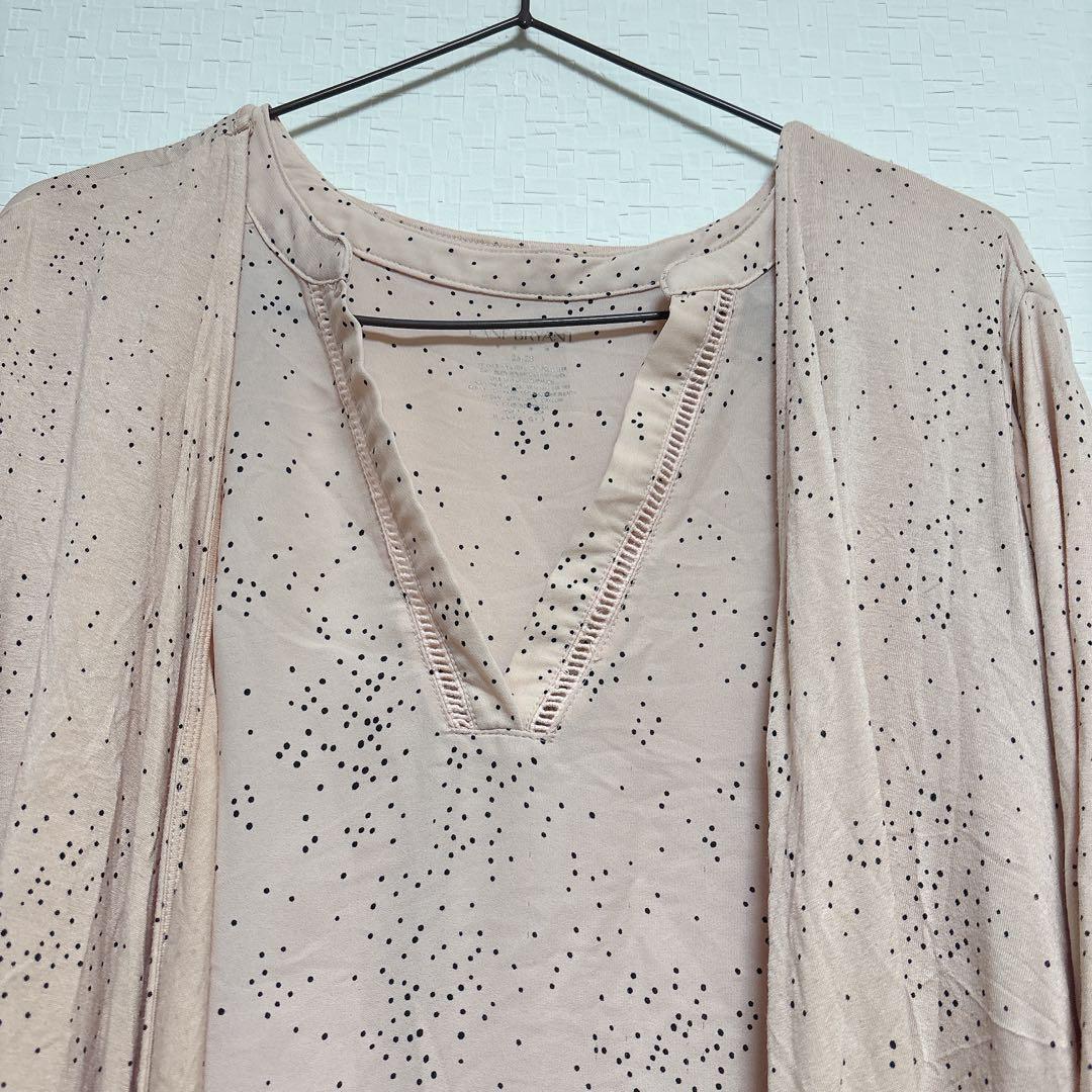 ドット柄のピンクカーディガンとTシャツの2枚セット。軽やかな素材で着心地良好。