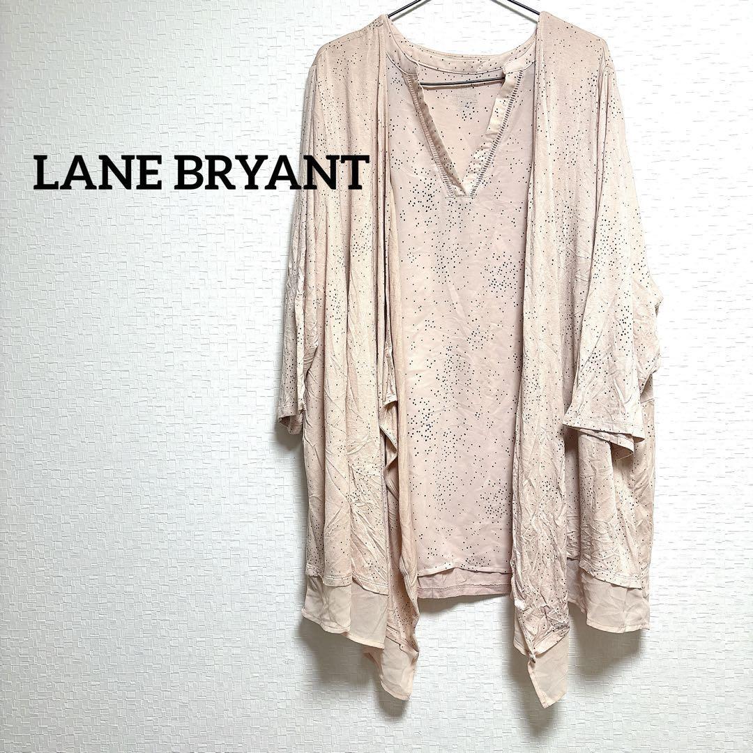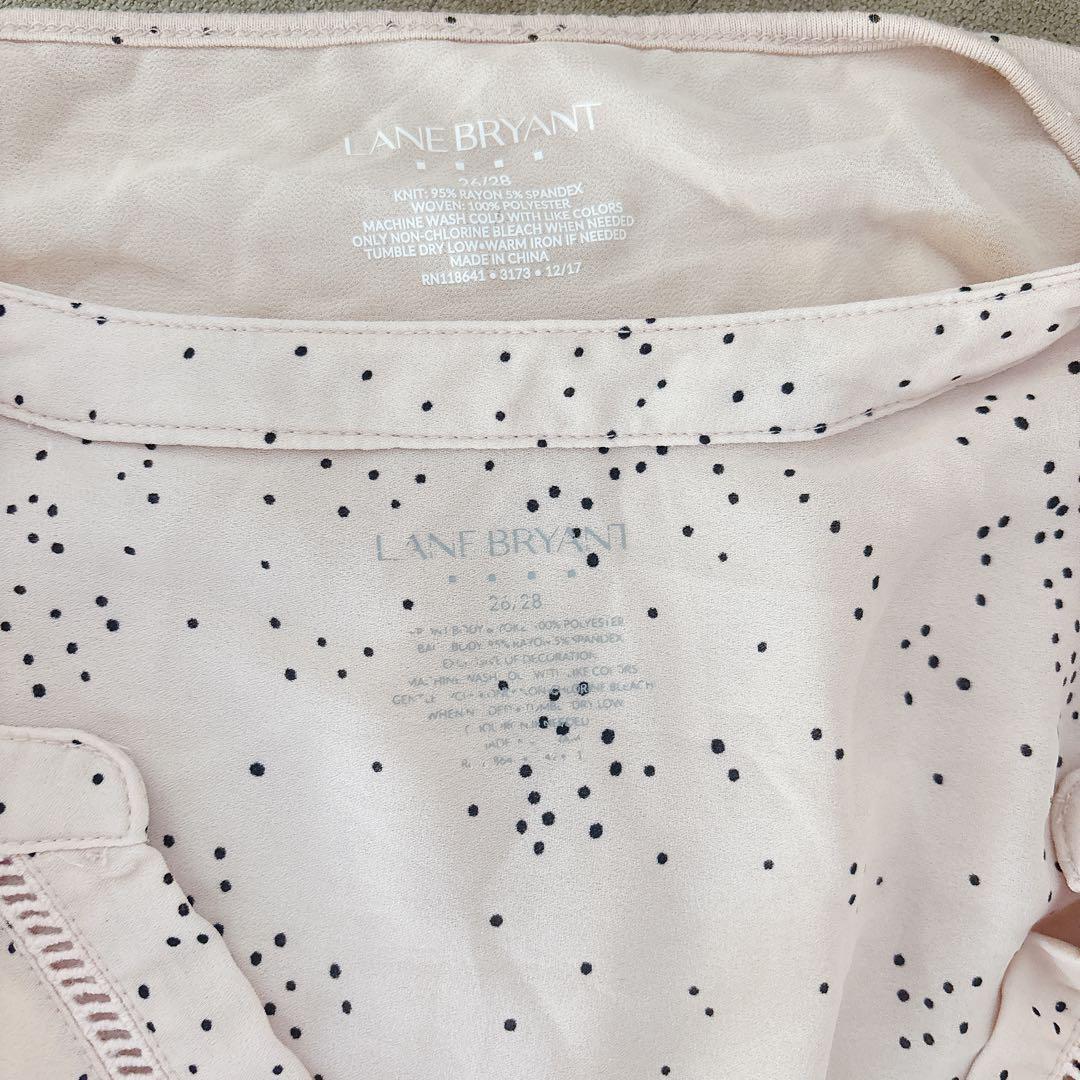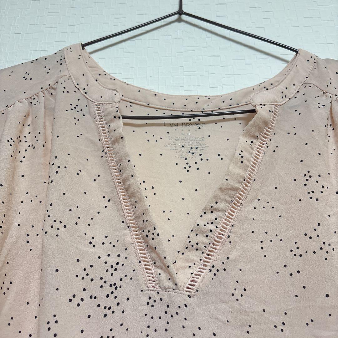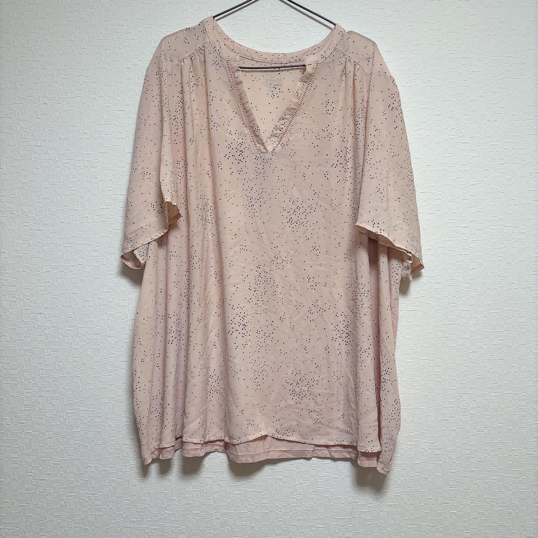 ドット柄のピンクカーディガンとTシャツの2枚セット。軽やかな素材で着心地良好。