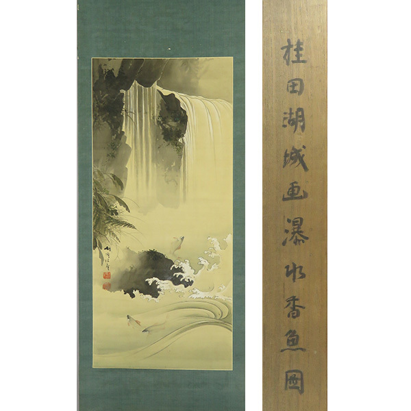 B-4133【真作】桂田湖城 肉筆絹本淡彩 瀑水香魚図 掛軸/日本画家 滋賀 師・今尾景年 四条派 山水図 書画