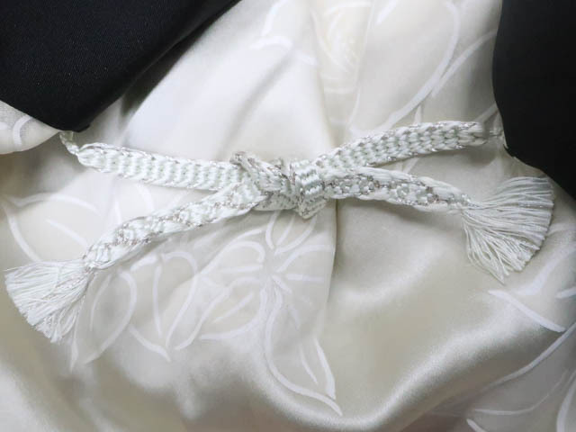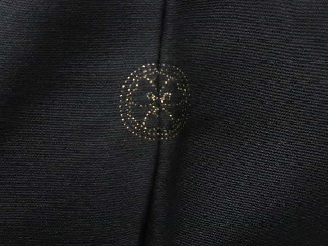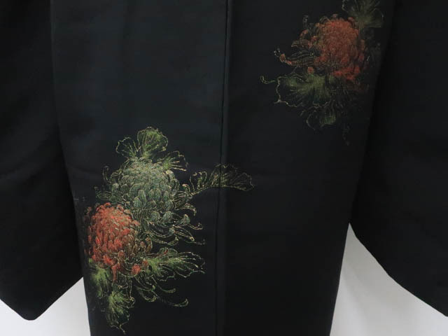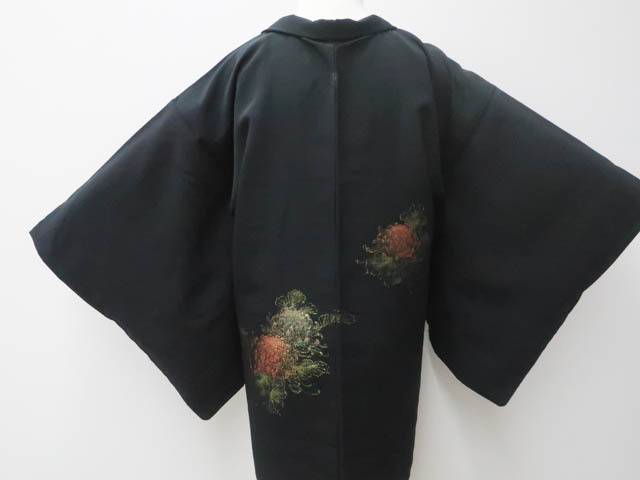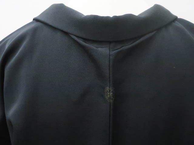 リサイクル商品のため、羽裏にシミ、袖口に薄汚れ、右前身頃に小さな汚れがございますが着用可能なお品です。 地色は、黒色です。 1枚目の画像が近いお色かと思われます。 素材は正絹です。 |