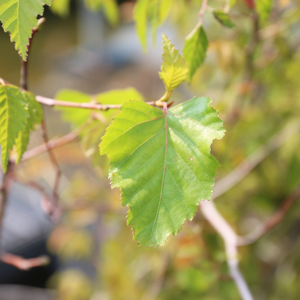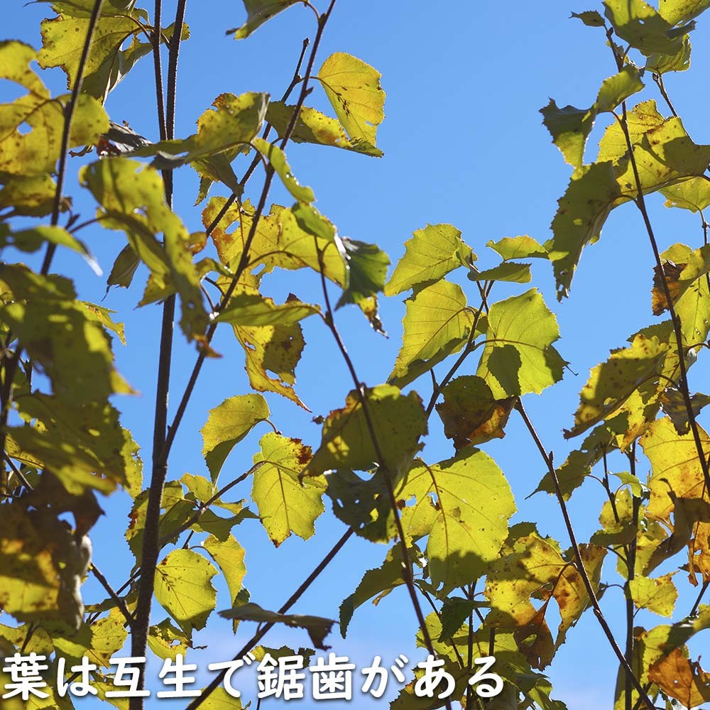 シラカバは白い樹皮が特徴です。樹皮は白く薄く横にはがれます。葉は明るい緑色でつやがあり爽やかな印象を受けます。秋には美しく黄葉します。樹形は整った卵型になります。寒冷地での生育が適しています。