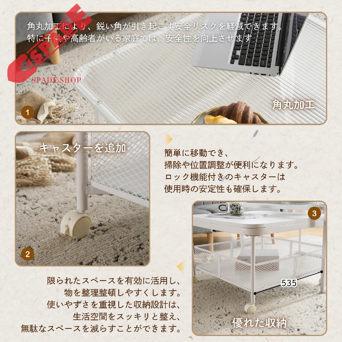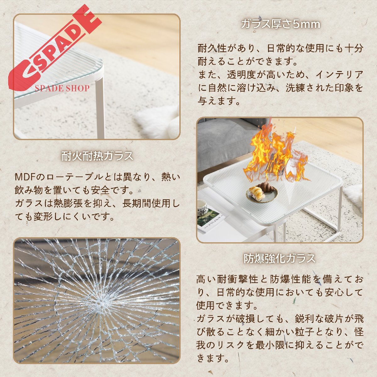 • 【安定性と耐久性】 天板はガラスを使用し、テーブルの脚は丈夫なスチールメタル製で、製品の安定性と耐久性を確保しています。角のない丸みのあるデザインでお子さまがいるご家庭でも安心。強化ガラス天板は透明感があり、ソファ横やベッドサイドに置くだけでスタイリッシュでやさしい雰囲気を演出します。デスクワークや読書、リラックスタイムにもぴったりです。