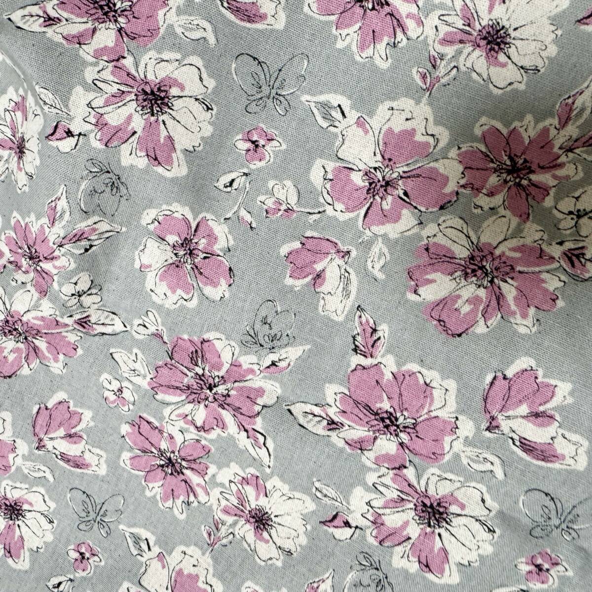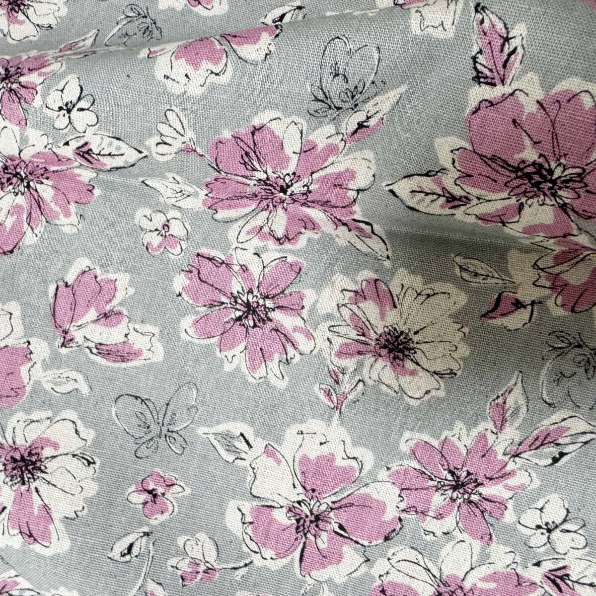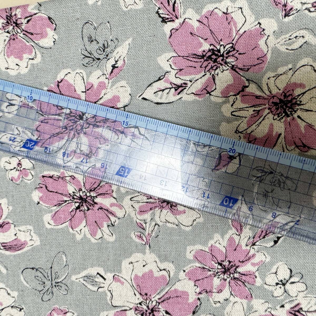 手描き風おとなの花柄コットンリネン生地はぎれ布50c★グレーにピンクちょうちょ