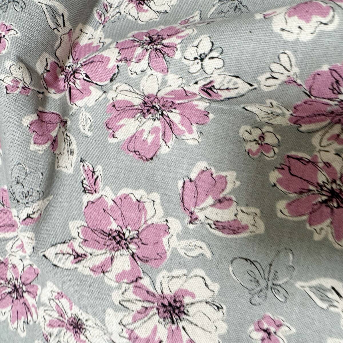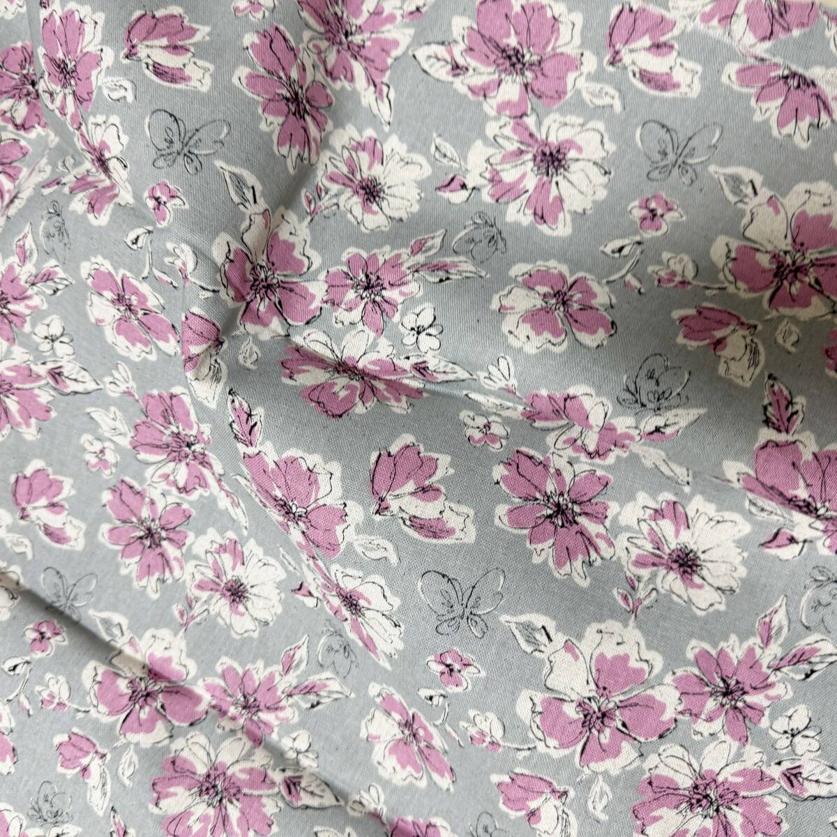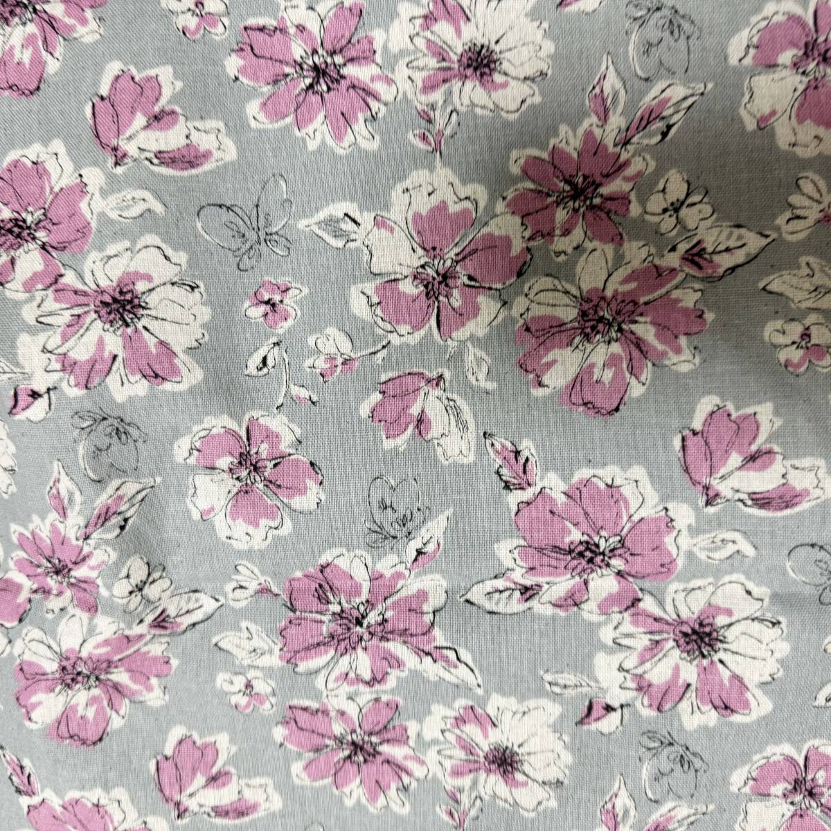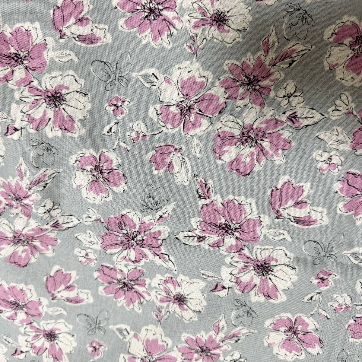 手描き風おとなの花柄コットンリネン生地はぎれ布50c★グレーにピンクちょうちょ