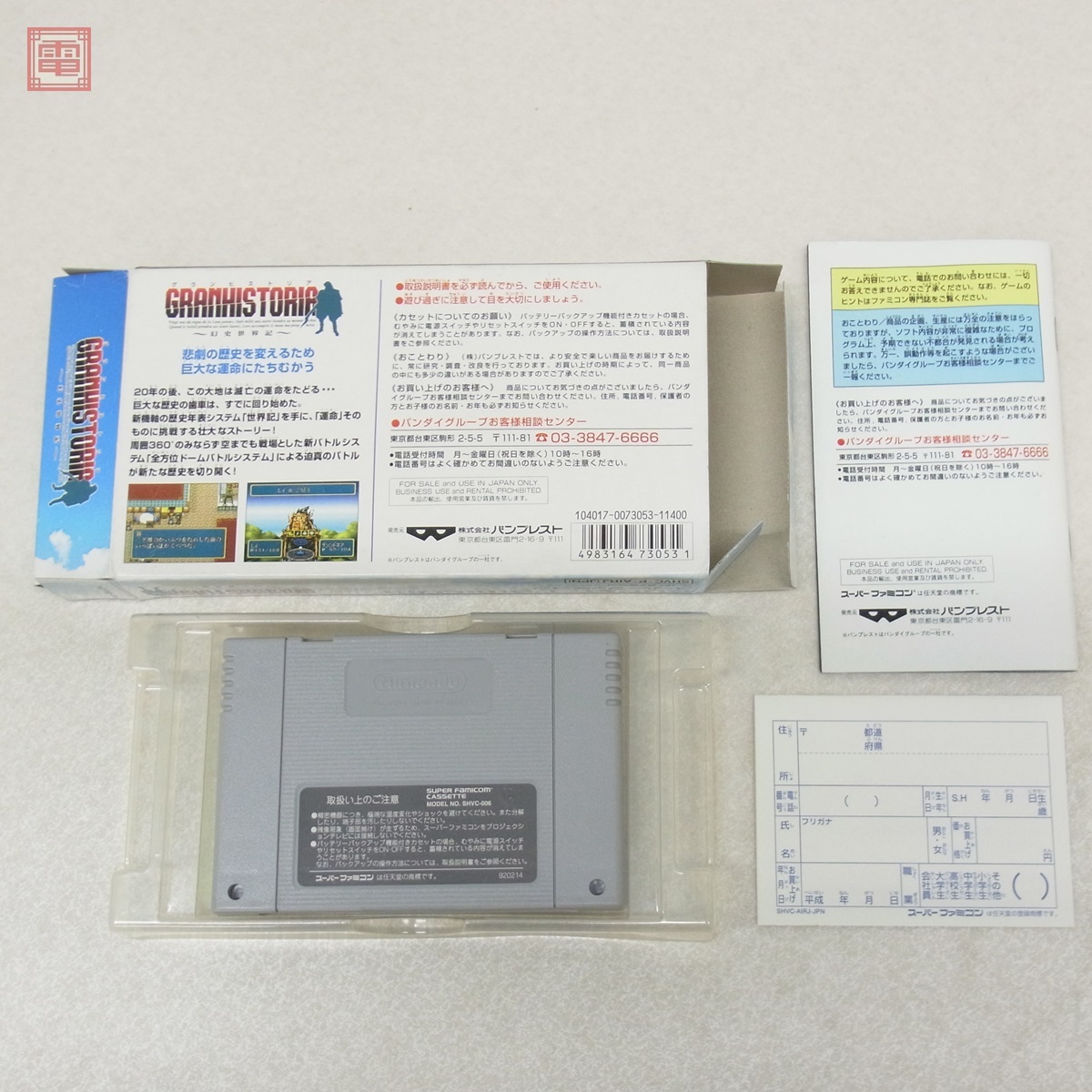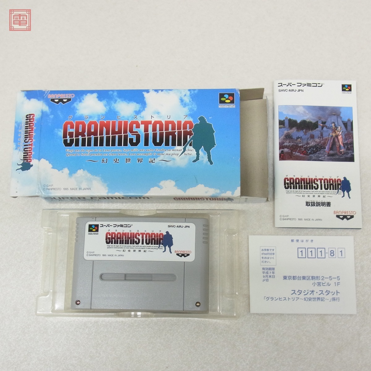 動作保証品 SFC スーパーファミコン グランヒストリア GRANHISTORIA バンプレスト BANPRESTO 箱説ハガキ付 こちらの商品は動作保証品となりますので、一週間の動作保証をお付けします。 ■箱にスレ、角スレ、汚れ、ヤケ、ヘコミ、キズがあります。 ■取扱説明書にスレ、角スレ、汚れ、シワ、ヤケ、ホチキス部のサビがあります。 ■カセットにスレ、キズ、汚れがあります。 ■上記以外は未チェックです。 ■写真のものが全てです。付属物の有無や状態については写真からご判断ください。 ■付属物については細かいチェックはしておりませんので、万が一、欠品があったり余計な物が入っていたとしてもご了承ください。 ■商品到着後、当店の保証期間中は、商品及び箱や取説、付属品などを1つでも廃棄や破損をしないようにお願い致します。廃棄や破損をした場合、商品に問題があった場合でも対応や返金などの対処ができなくなります。 ■商品によりますが、発売されてから10年以上経過している中古品である事をご理解頂いた上でご入札をお願い致します。なお、新品や美品、また特記事項がある場合は別途明記します。 | |||