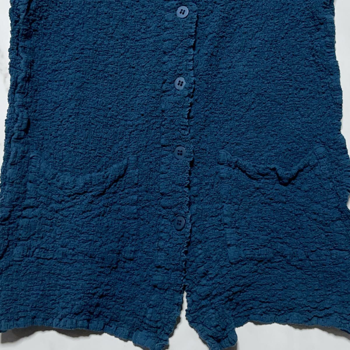 独特の素材が生み出す立体的なシルエットと、シンプルなデザインの美しさが調和した、ワードローブに一枚あると便利なカーディガンです。