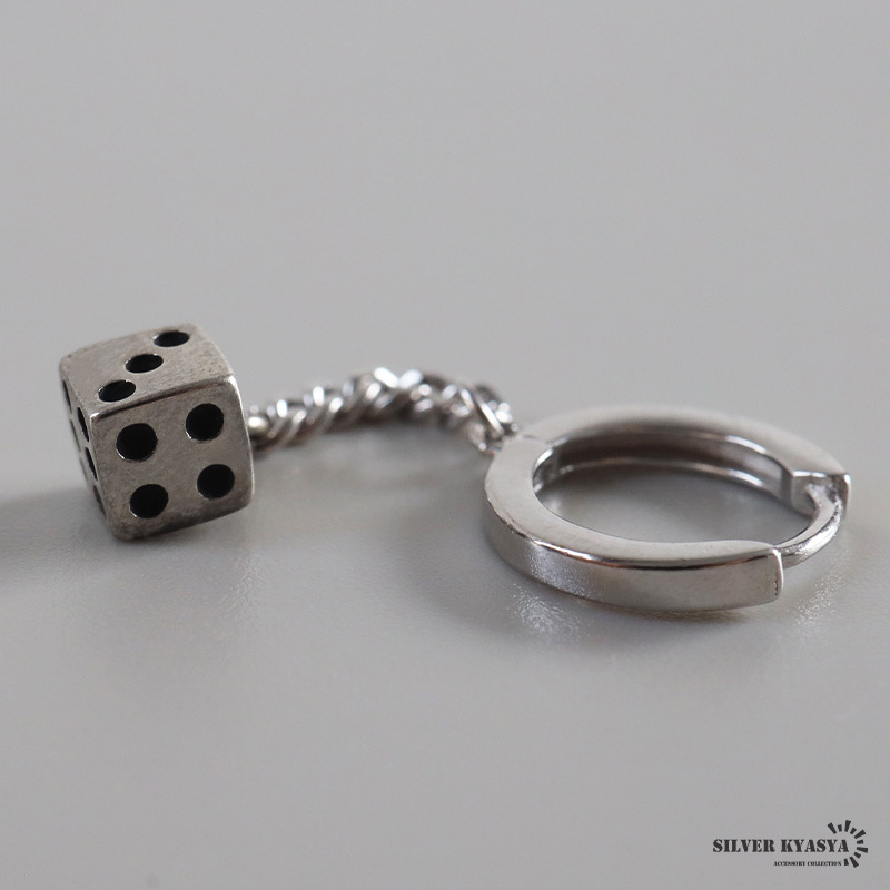フープからチェーンに繋がれたサイコロのドロップピアス。コロンとしたチャームが揺れ動く度に目を惹きます。シルバー925の上品な輝きが魅力的なアイテムです。主役アイテムとして個性たっぷりな存在感を演出◎