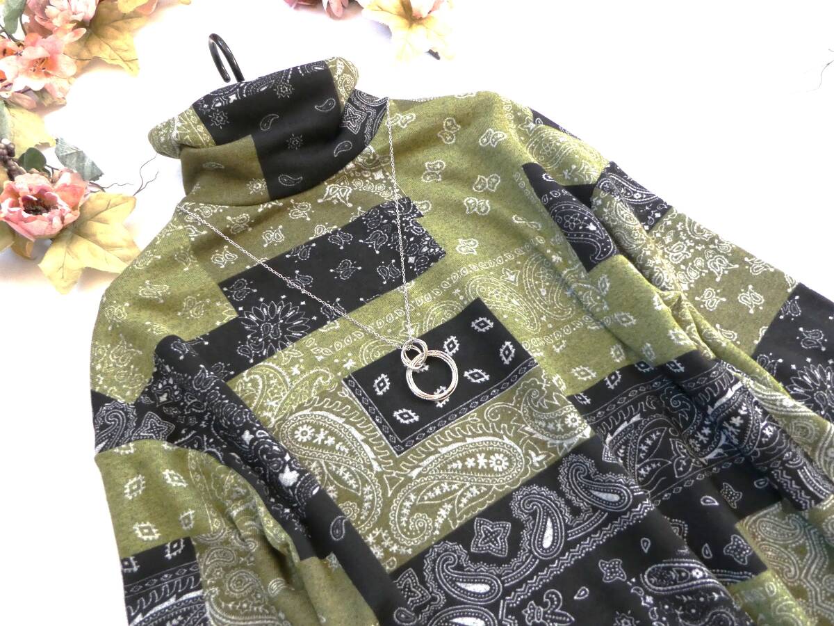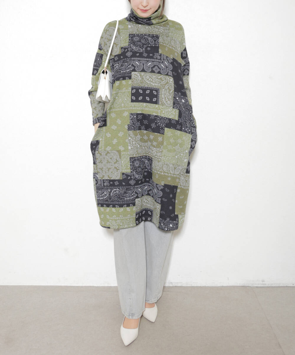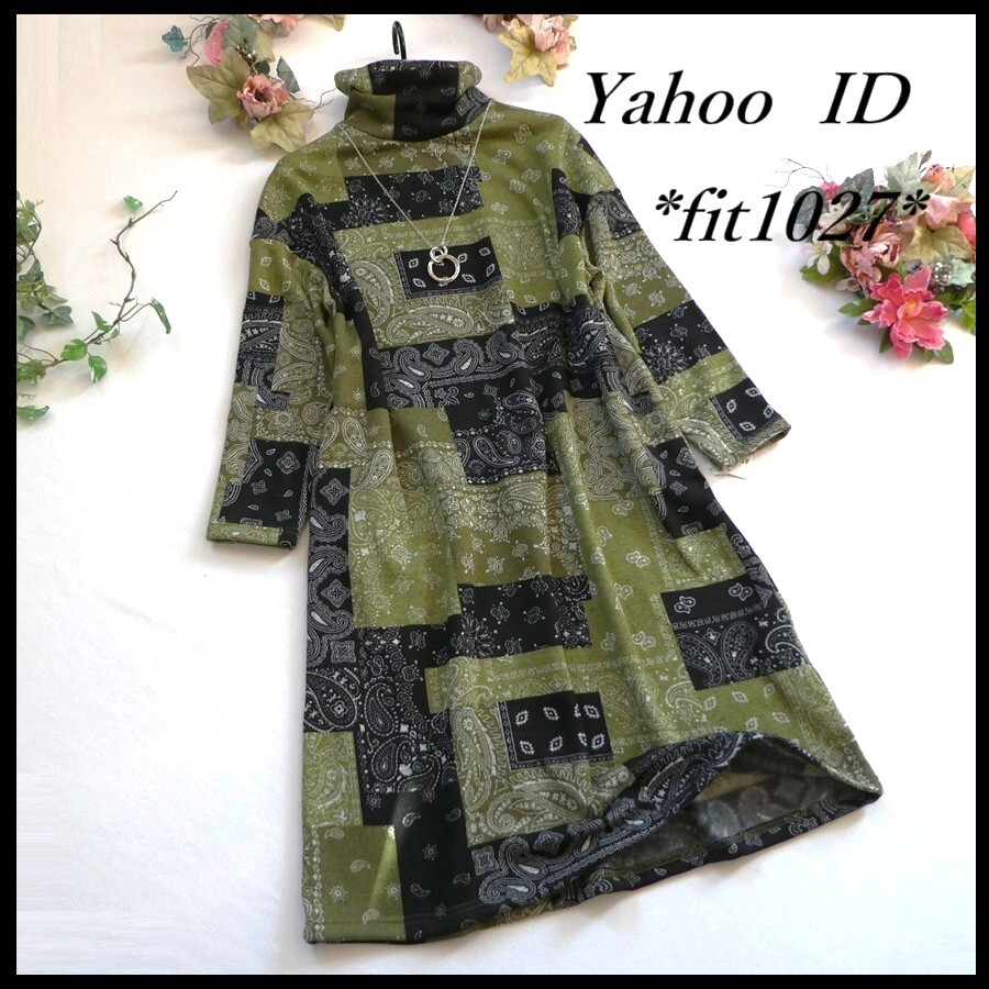 ゆったりサイズ【新品】裏起毛ニットソー素材♪ペーズリーmode柄プリント◇オフタートルネックチュニック・ワンピ・グリーン◆fit1027◆