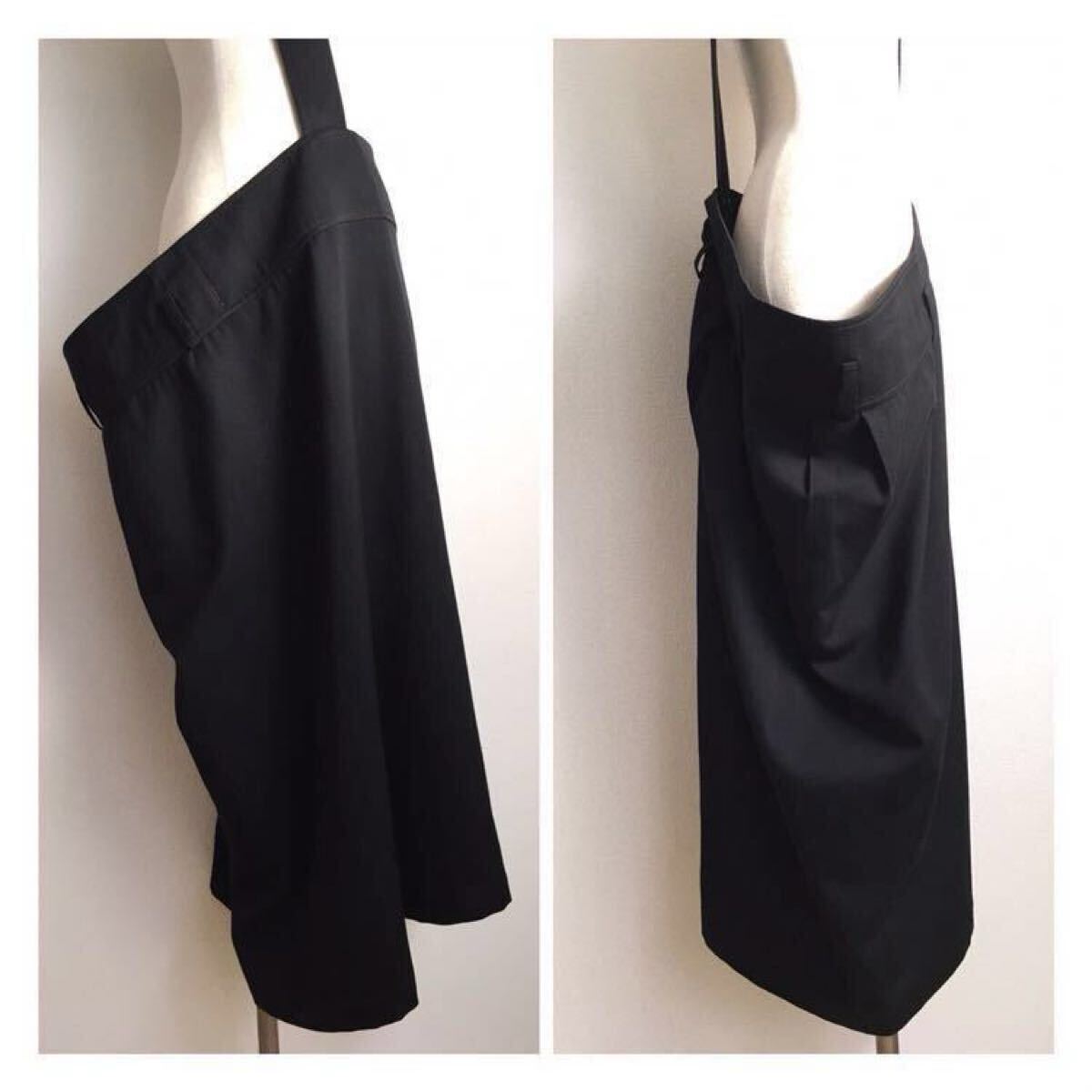超オーバーサイズのスカート部分にストラップが付いており、後内側のボタンに留めて着用します。