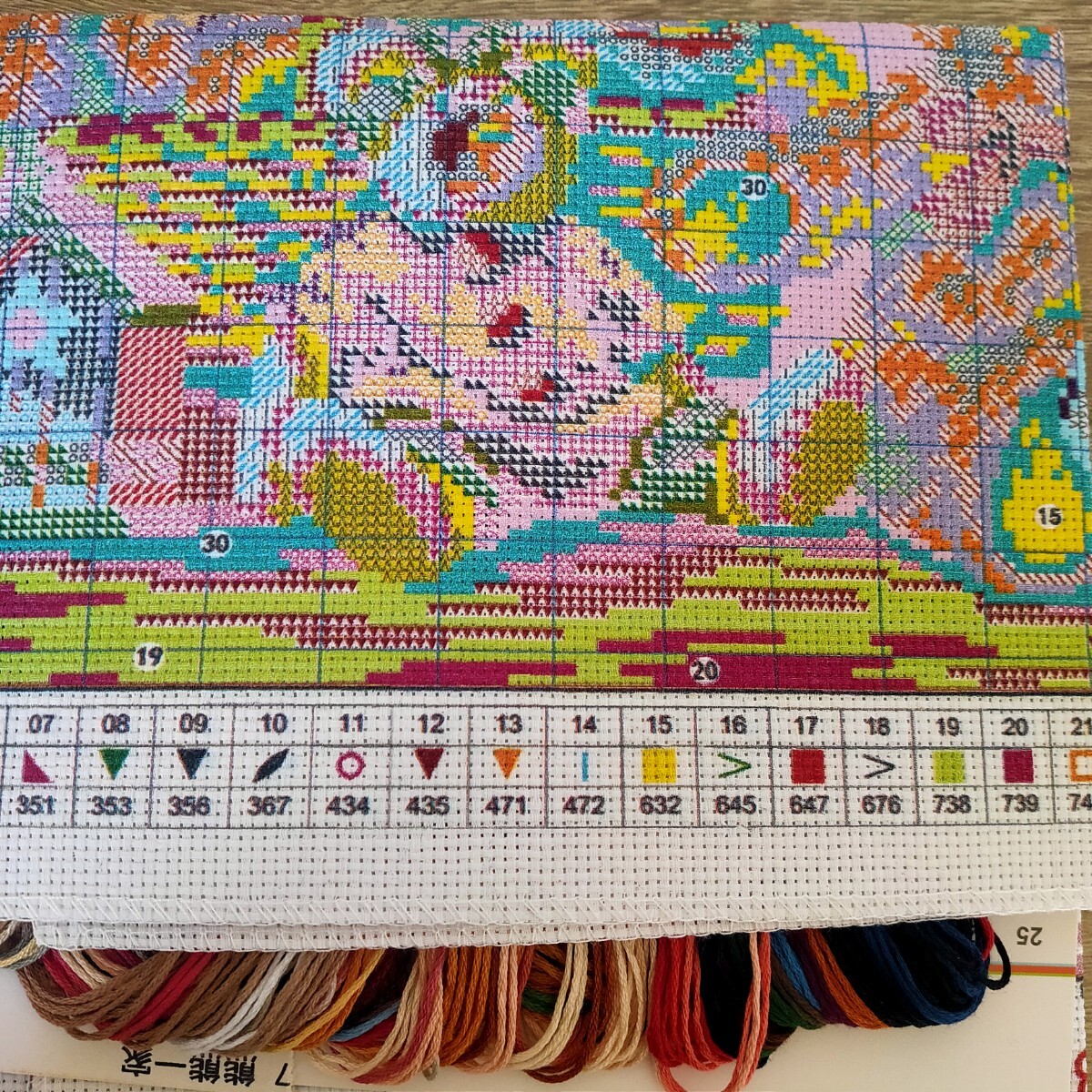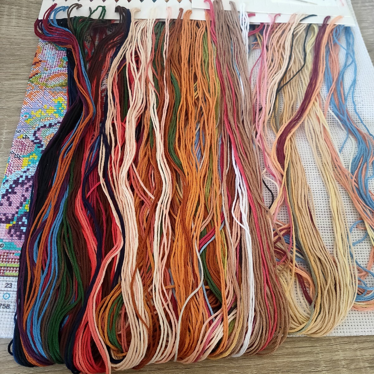 刺繍糸は余分に見積もって入っていますが、製作中もし足りなくなった場合は、ご自身でご用意ください。DMCの糸番号に対応しています。検品のため1度開封しています。