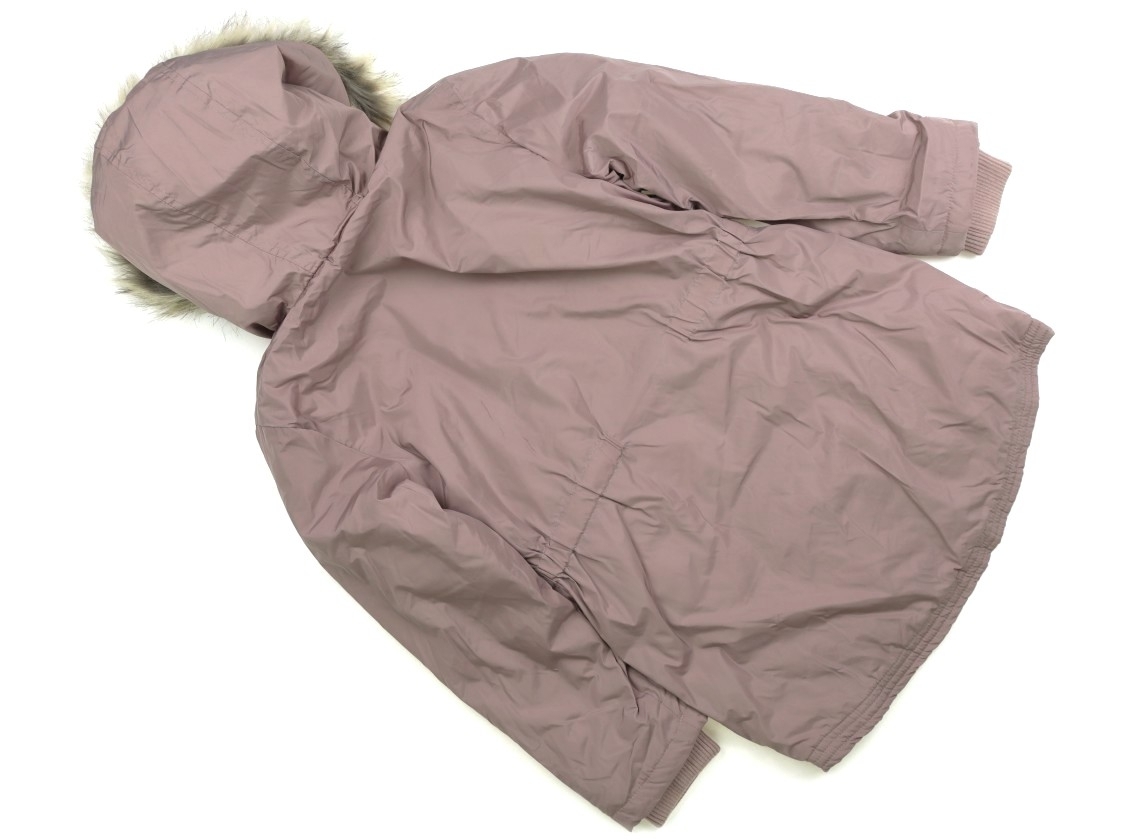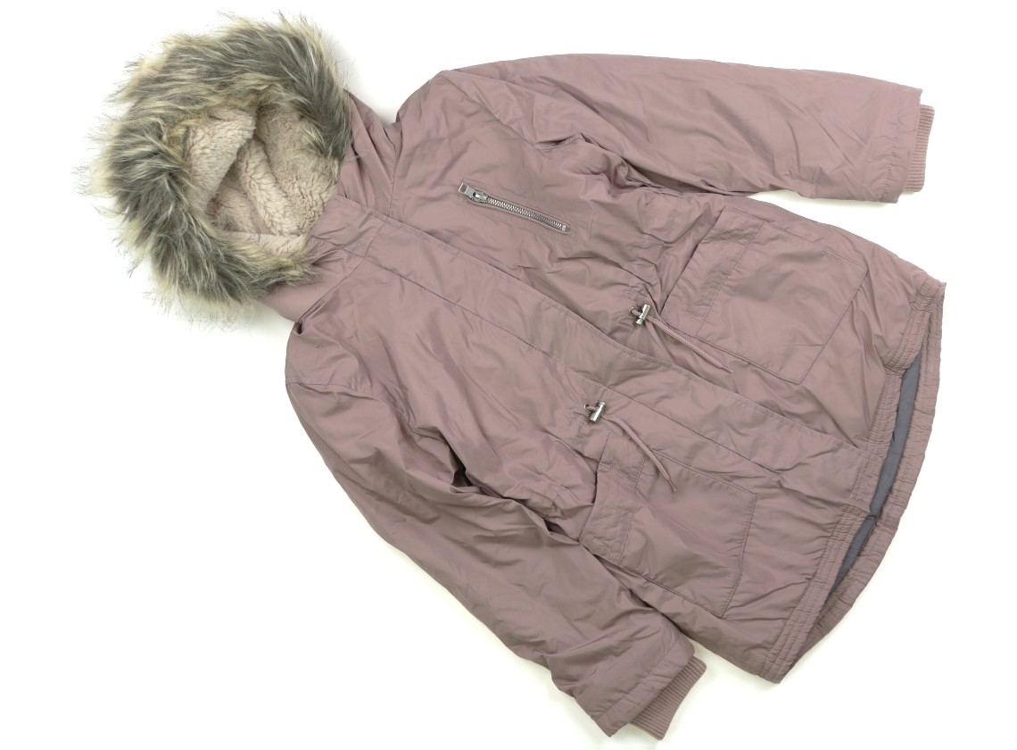 ポリエステル素材。中綿入り。身頃裏地はボアファー素材。フードは縫い付けです。ファスナー・スナップボタン開き。袖口が汚れています。ほかにもいくつかの汚れが見られます。