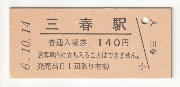 平成6年10月14日 磐越東線 三春駅 140円硬券普通入場券(日付印刷)