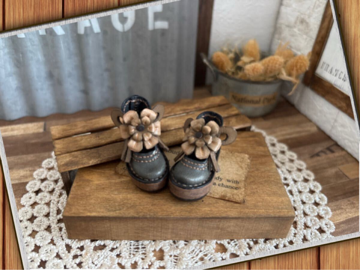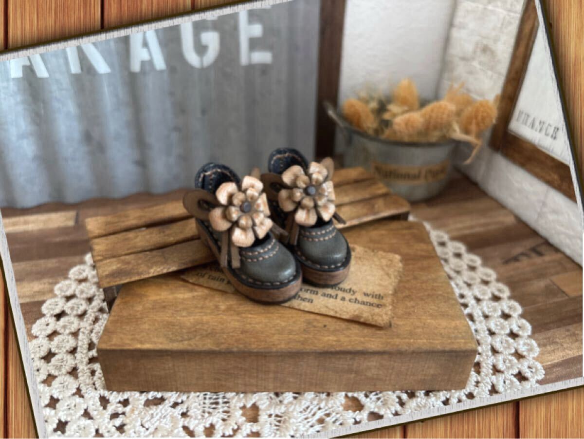【素材/色】牛ヌメ革/グレー お花は淡ベイクドダークブラウン 靴底はブラック