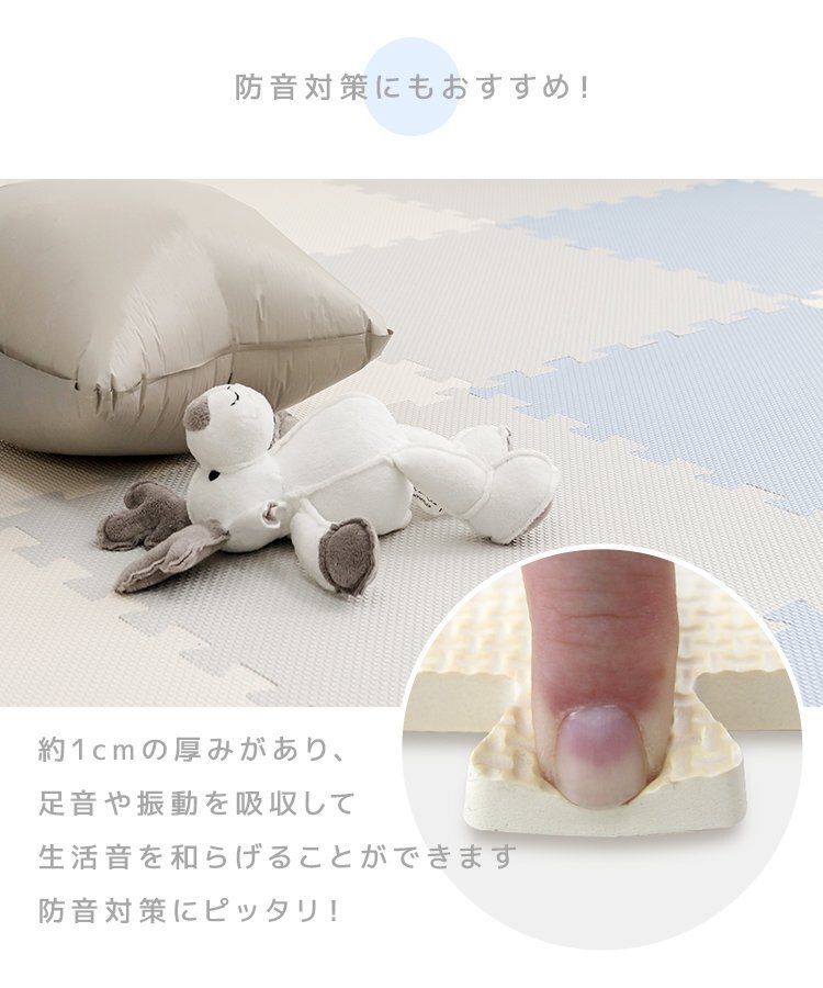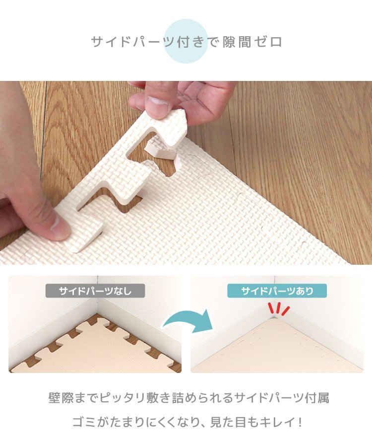 | 大判サイズで敷く枚数も少なく設置もラクラク♪ カッターやはさみで簡単に切れるのでレイアウト自由自在! 環境に優しくキズや衝撃に強いPE素材を採用! 適度なクッション性が転倒時に衝撃をやわらげます。 また、約1cmの厚さ足音をやわらげ、防音対策としても最適です。 冬は床下からの冷気をカット! 夏は冷房による温度を効率よく保ちます。 サイドパーツ付きで隙間ゼロ! ゴミも溜まりにくく、見た目もキレイです☆ 屋外でも使えます! ペットがいるご家庭にもおすすめです。 【商品仕様】 サイズ(約):縦45×横45×厚み1cm(※1枚) カラー:ソフトグレー 素材:PE樹脂 【商品内容】 ジョイントマット×48 サイドパーツ(角付きパーツ48本、角なしパーツ48本) ※入荷時期によって、厚みや幅に多少の誤差がある場合がございます。あらかじめご了承ください。 ※仕様・デザインは改良のため予告なく変更することがあります。 ※床材との温度差で製品が反る場合があります。 |