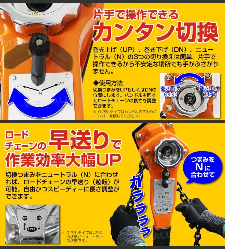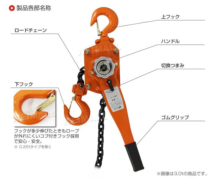チェーンの早送りもワンタッチでできるので作業のスピードアップにもつながること間違いなし!! 【使用用途】 ・重量物の緊縛輸送 ・鉄骨の歪み取り ・大型機械や荷物などの引き寄せ ・建築物の芯だし ・板金塗装のフレーム修正 ・山林業や果樹園での原木搬出・抜根・杭抜作業 ・景石・柱石・ヒューム管などの据付作業 ・運輸・橋梁・建設・土木・造船・林業などの荷揚げ・揚重・現場作業 【仕様】 ・最大能力・・・・・・・1,000kg ・チェン線径・・・・・・φ5.8mm ・巻き取りチェン長さ・・・・1.5m ・フック開口寸法・・・・・・28mm ・上下フック間最小寸法・・・325mm ・ハンドル長さ・・・・・・280mm ・重量・・・・・・・・・7.5kg ※写真と実物は多少異なる場合がございます。あらかじめご了承下さい。 |