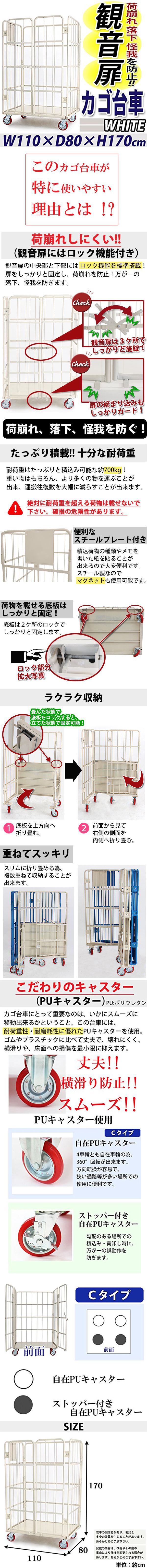 | 商品名 | 観音扉カゴ台車 W110×D80×H170(cm) 耐荷重700kg 2ドア 扉付き かご台車 ロールボックス ロールパレット パレット 看板スチールプレート 観音開き 業務用台車 大型台車 倉庫 運搬 物流 移動 荷物 1100×800×1700 キャスター Cタイプ ホワイト cago2doorw110c |