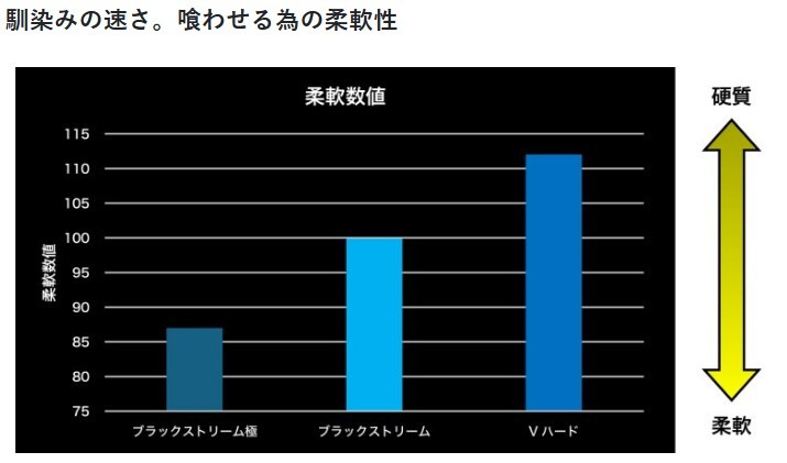通常のブラックストリーム(プラズマライズ)の柔軟性を6段階評価で4とするとブラックストリーム極は特許秘術「DPP(特第6841410)」により10cm間隔で5と6の異なる柔軟糸質に変化させている。
