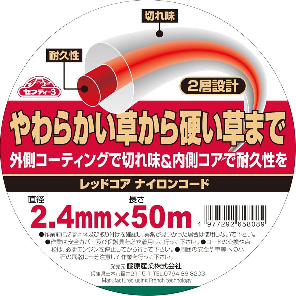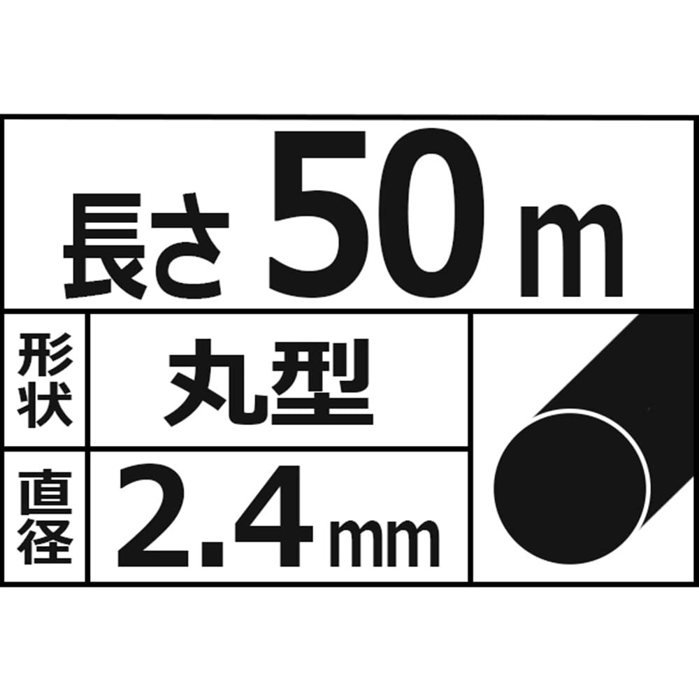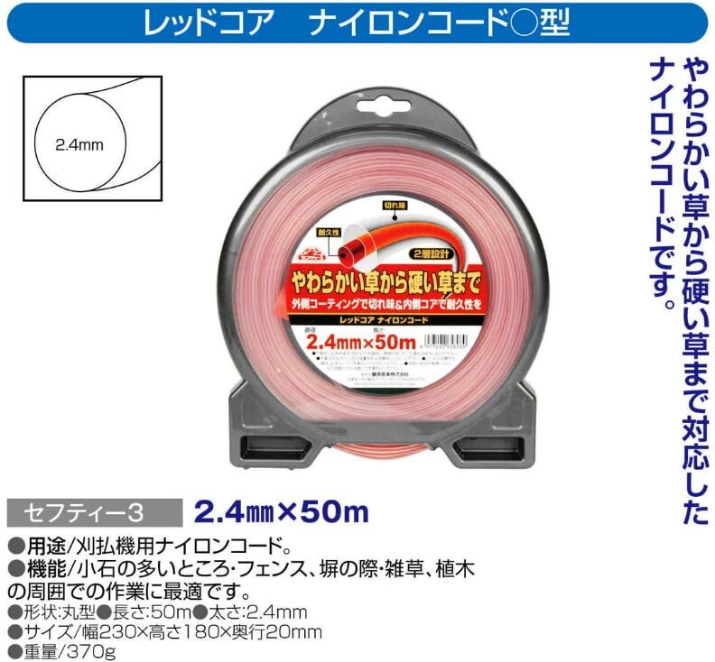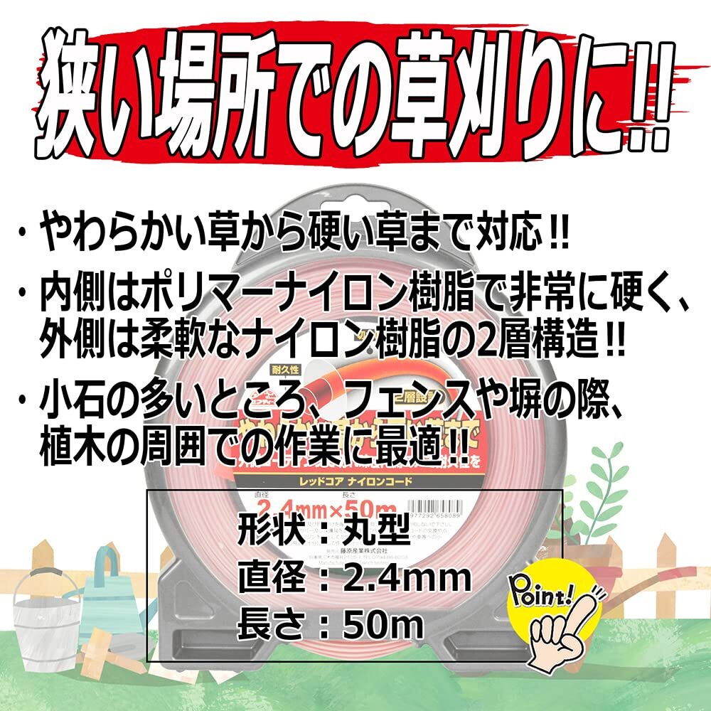 「商品情報」外側コーティングで切れ味・内側コアで耐久性の2層設計【用途】草刈作業用【特徴】・内側はポリマーナイロン樹脂で非常に硬く、外側は柔軟なナイロン樹脂の2層構造・やわらかい草から硬い草まで対応したナイロンコード・小石の多いところ・フェンス、塀の際・雑草、植木の周囲での作業に最適【注意事項】※作業前に必ず本体及び取付を確認し、異常が見つかった場合は使用しないで下さい。※コードの交換や点検は、必ずエンジンを停止してから行って下さい。※作業は安全カバー及び保護具を必ず着用して行って下さい。※周囲の安全や車等への小石の飛散に十分注意して作業を行って下さい。「主な仕様」特徴1:内側はポリマーナイロン樹脂で非常に硬く、外側は柔軟なナイロン樹脂の2層構造特徴2:やわらかい草から硬い草まで対応したナイロンコード形状:丸型直径:2.4mm長さ:50m