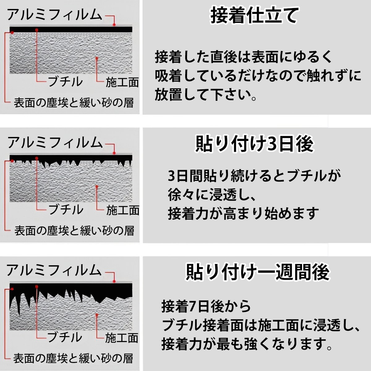 多目的の防水・断熱シートです。 面積が広い範囲の水漏れ対策や面積が狭い範囲の雨漏り補修。 建設作業の防水や人工池の作成まで、幅広く使えます。 表面に用いられているアルミ箔は熱反射効果が高く、長時間日光に当たっても問題なく、 屋根等に施工する事で高い断熱効果を発揮します。 ヒビ割れ隠しにも効果的です! 保護フィルムを剥がして設置場所に貼るだけの簡単施工。 お一人でも施工して頂けます! |