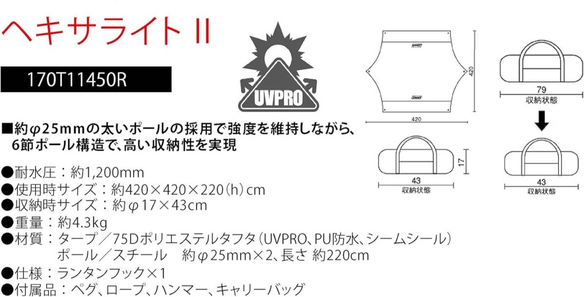 色:ブラウン ブランド:Coleman(コールマン) 材質:ポリウレタン, ポリエステル, 合金鋼 耐水レベル:防水 サイズ:使用時/約420×420×220(h)cm、収納時/直径約17×43cm 質量:約4.3kg 材質:タープ/75Dポリエステルタフタ(UVPRO, PU防水、シームシール)、ポール/スチール直径約25mm×2、長さ約2200cm 耐水圧:約1200mm 仕様:ランタンフック×1 付属品:ペグ、ロープ、ハンマー、キャリーバック商品の重量4.3 キログラム ★ペグについて鍛造ペグ20㎝8本付属。 ★かなり丁寧に使っていましたのでまだまだ使用出来ます。 ★4ヵ所微小の穴が有りますが専用のボンドにて修復してあります。(写真参照) | ||||