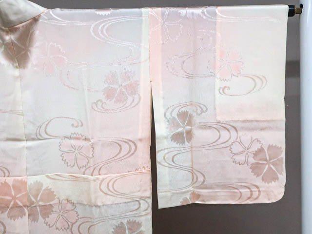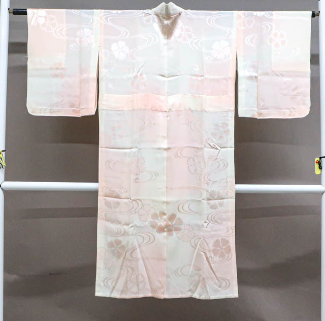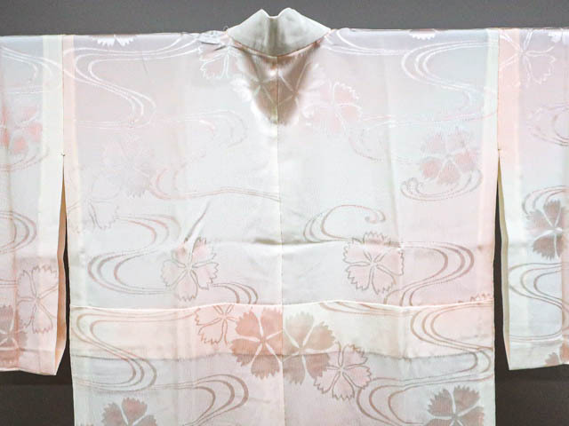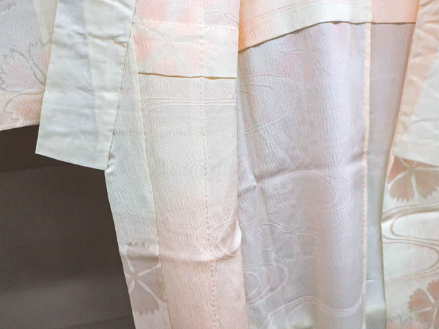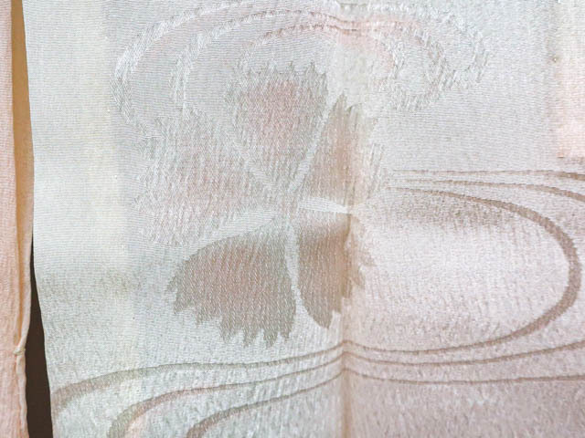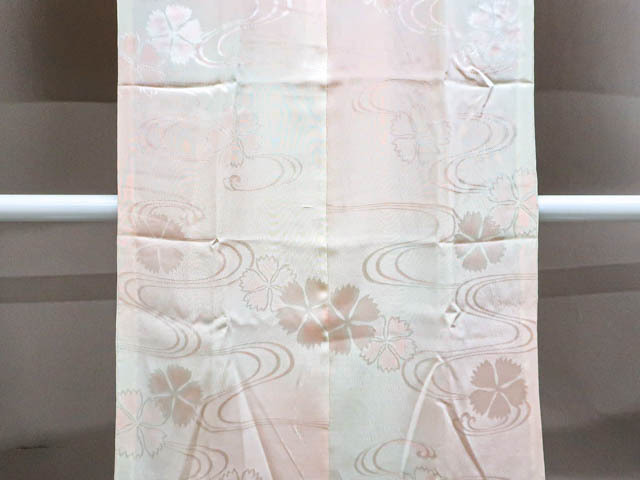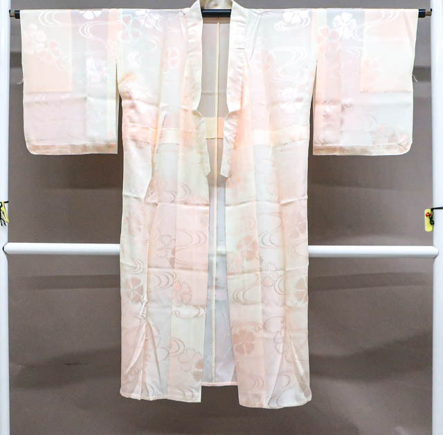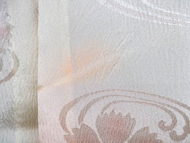 リサイクル商品のため、右脇下辺りにシミがございますが着用可能なお品です。 地色は、薄ピンクです。 1枚目の画像が近いお色かと思われます。 素材は正絹です。 |