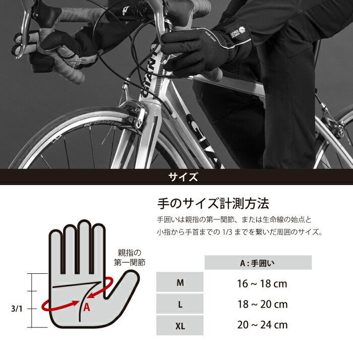 | GORIX ウィンター サイクルグローブ(gw-tf2a) サイズM ブラック 通風性材質、撥水防滴材質、フリース保温材質による3層構造で高い防寒性 指周りや通気口の生地は防水機能は無く通気性をアップ 冷たい風や雨から指先をしっかり保護して蒸れずに快適 手の平には3mmのSBR防水材質の厚手のクッションパッドで衝撃を吸収 ハンドル操作に必要な指先等には滑り止め加工で操作しやすい 外気を遮断して程よく密着させるゴム締めと、 長めの裾で袖周りを覆い、冷気の進入を防止する優れた防寒防風性能 手の甲には夜間走行でも安心の反射材質使用 材質:ポリエステル60%、ナイロン20%、スポンジ15%、スパンデックス5% | |