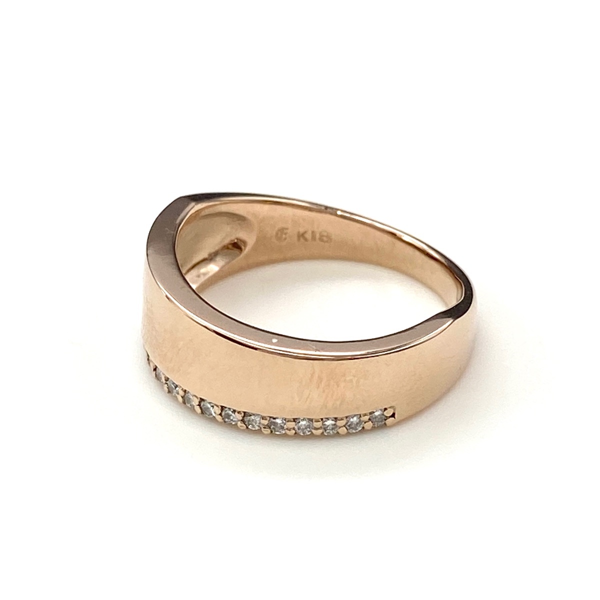 実寸サイズ| 約12号 | リング最大幅 | 約7.4mm | リング最小幅 | 約2.4mm | リング厚さ | 約2.1mm | 素材 | K18、PG、ダイヤモンド | コメント | メレダイヤ:カラット刻印なし | 中古品の為、若干のキズや汚れがございます。 付属品 | なし | |