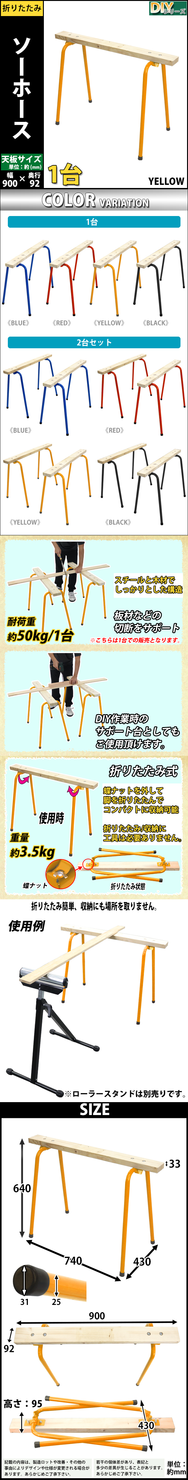 | 商品名 | 送料無料 ソーホース 折りたたみ 黄 1台 工作台 作業台 天板幅約900mm 天板奥行約92mm 高さ約640mm 耐荷重約50kg DIY 日曜大工 裁断 切断 簡易作業台 木工作業台 作業馬 作業机 ワークテーブル テーブル コンパクト 折り畳み ホビー イエロー sawhorset07yel1set |