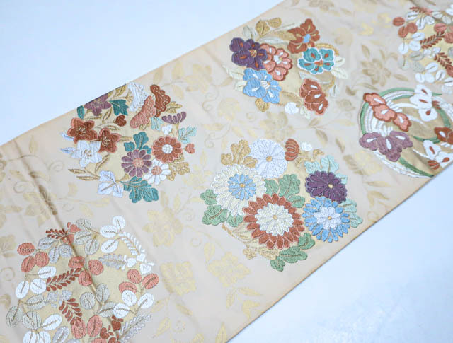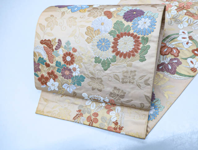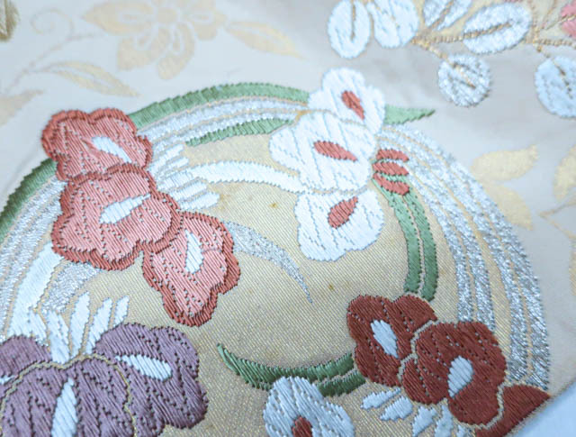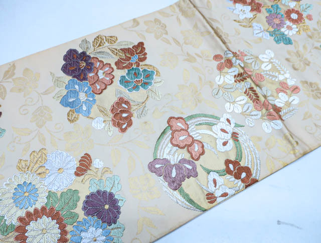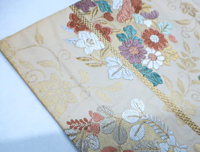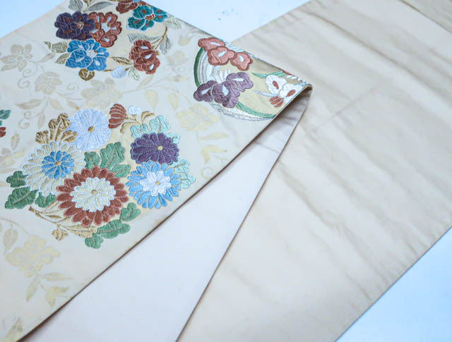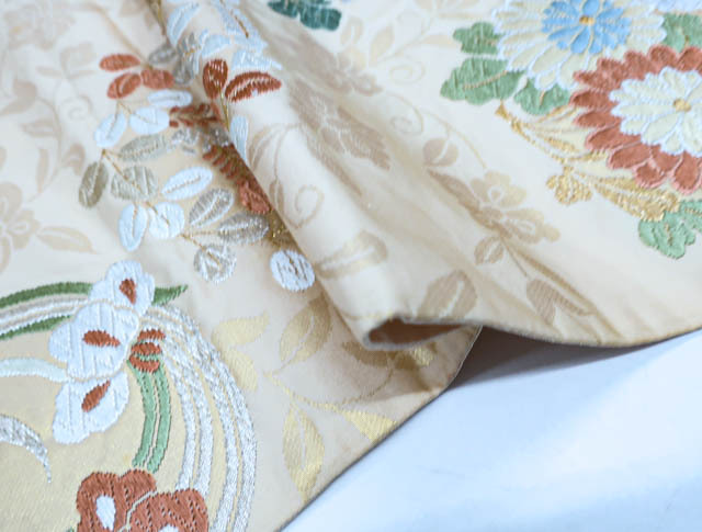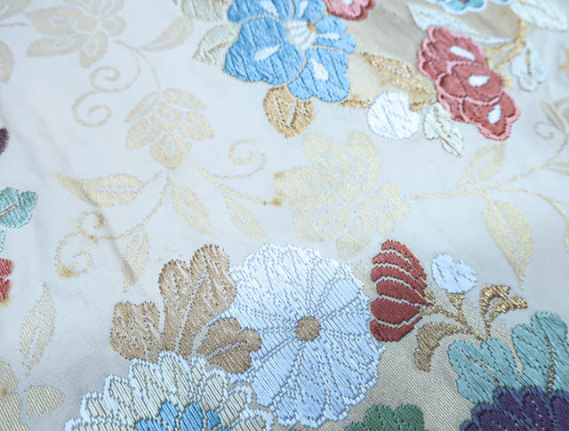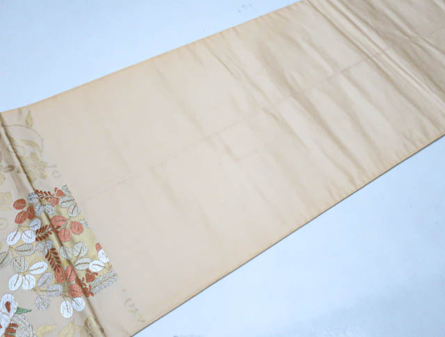 リサイクル商品のため、垂れ先、手先、無地場や裏地、柄の所々など全体的にシミがございますが、着用可能なお品です。 地色は、薄オレンジです。 1枚目の画像が近いお色かと思われます。 素材は正絹です。 |