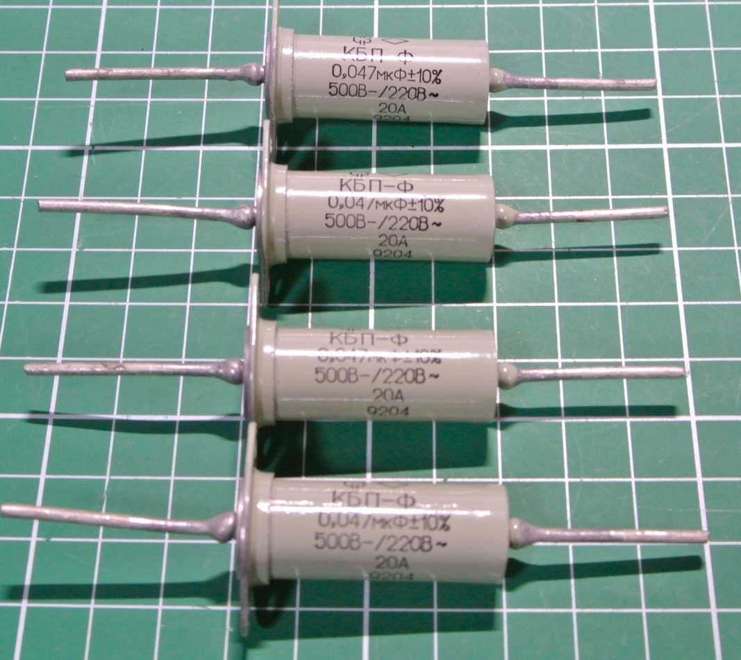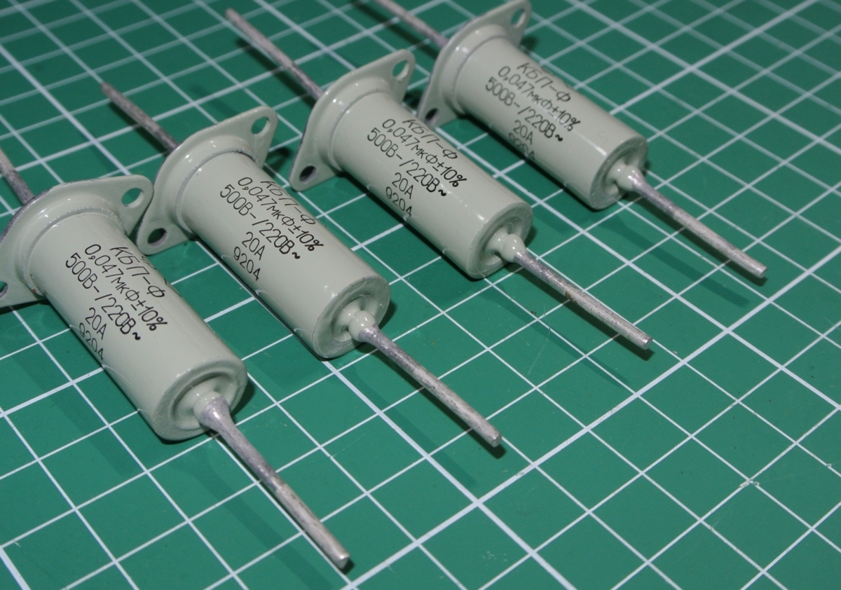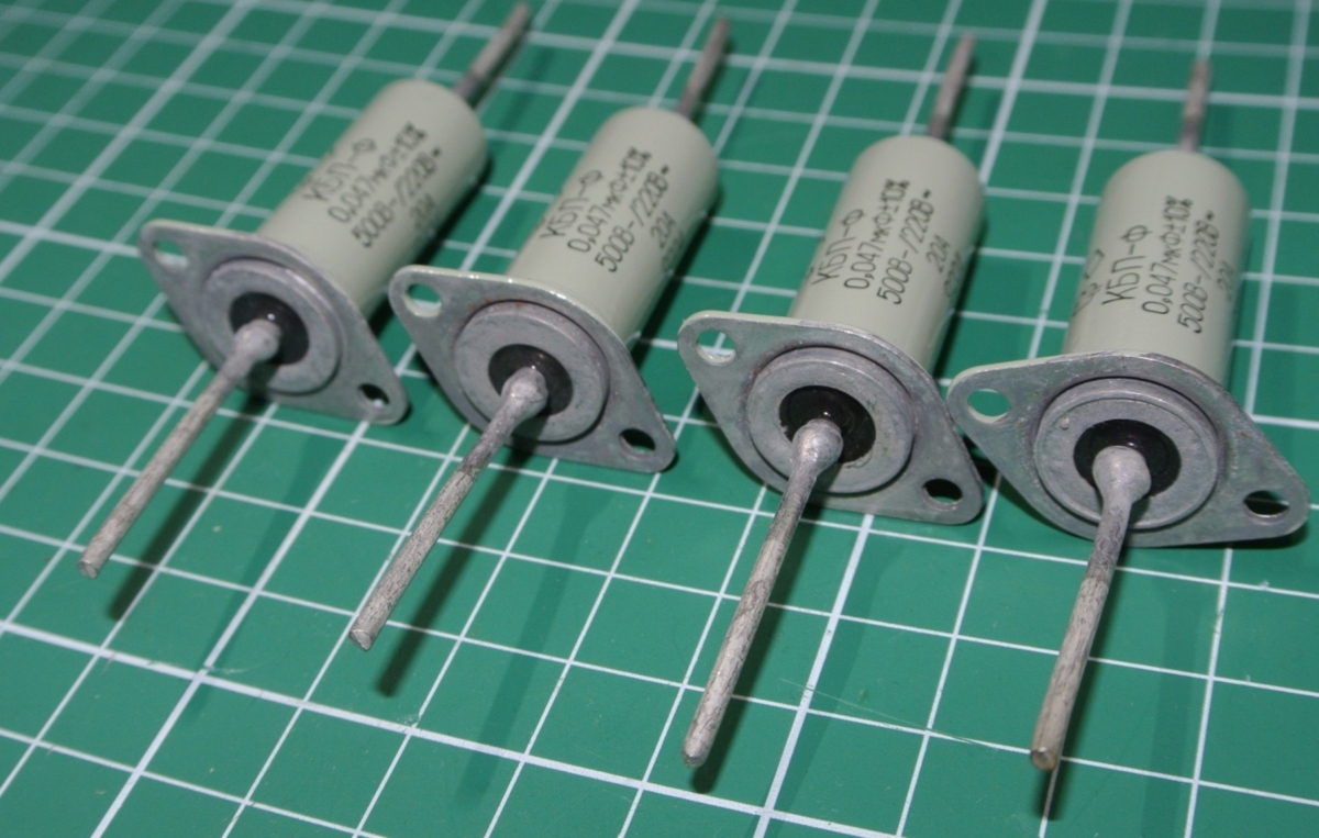 | 4個セット ロシア軍用 貫通型 オイル コンデンサ(PIO) 紙オイル 0.047uF DC/AC 500V/220V ボディーアース KBP20a | |
