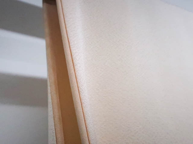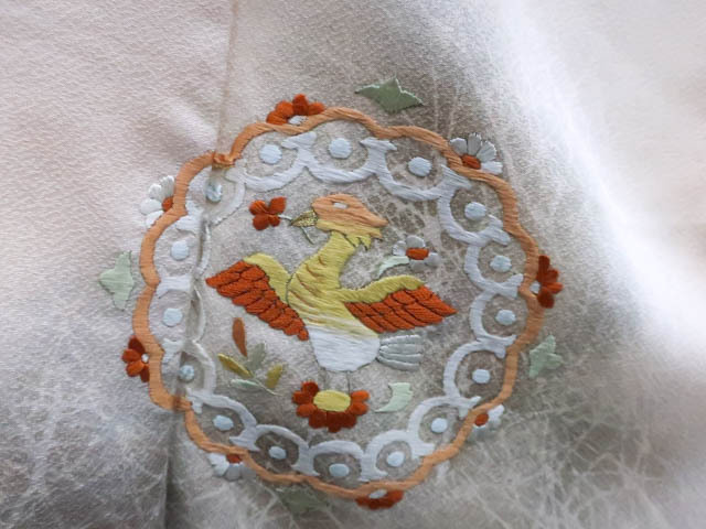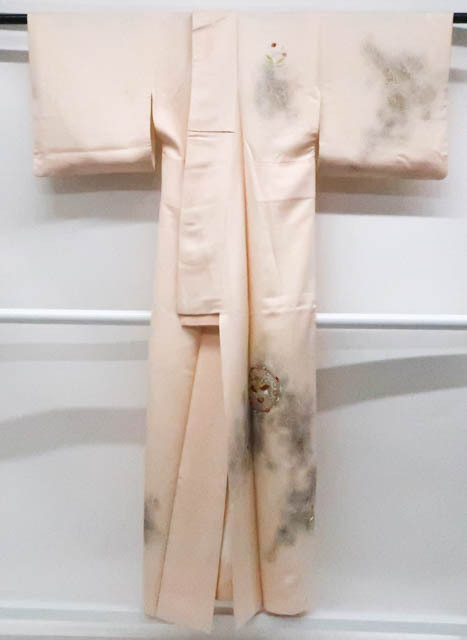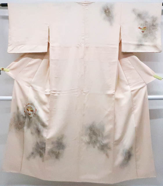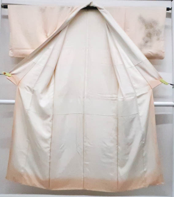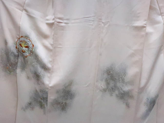 リサイクル商品のため、後ろ身頃や衿袖口など全体の所々汚れ、着用皺がございますがご着用いただけると存じます。 地色は薄ピンクです。 1枚目の画像が近いお色かと思われます。 素材は正絹です。 |
