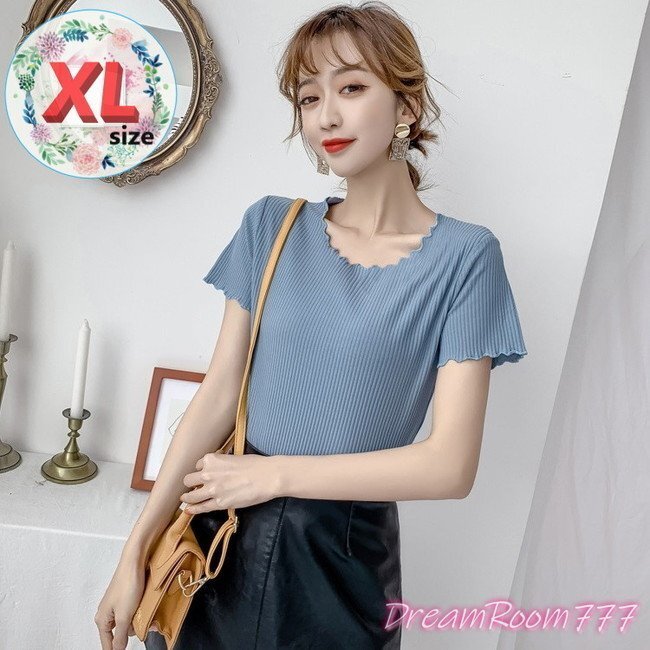 Solid color ラウンドフリル Tシャツ XLサイズ 美ライン 半袖 レディース オフィス カジュアル 無地 綺麗め K-088-5ブルー