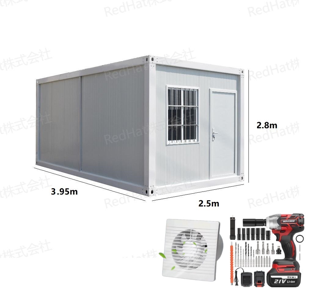 ドア 1 つと窓 1 つが付属しており、グレー、幅 2.5m、奥行 3.95m、高さ 2.8mの大きさで、重さは約 800KG。