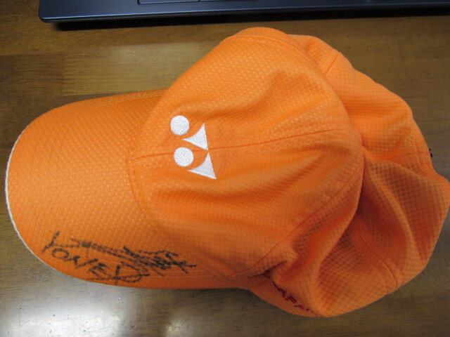 ヨネックス テニスキャップ「ALL JAPAN YONEX CUP」のサイン入りです。いつの年のYONEX CUPの物か、どなたのサインかはわかりません。未使用ですが、袋から出して保管してありましたので、日焼け、よれ、また画像4にあるような汚れがあることを承知で入札をお願いします。