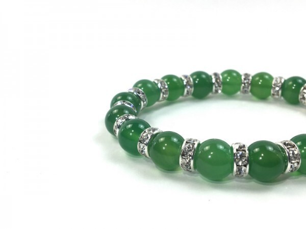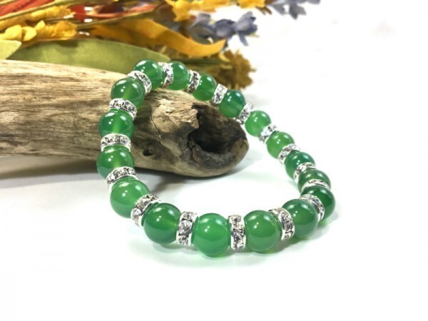 こちらは、10mm玉の緑瑪瑙を使用したパワーストーンブレスレットです。間にはロンデルを挟み高級感あるブレスレットに仕上げています。石大きさは腕にも馴染みやすいように10mm玉を使用して、サイズは内径約18cmです。(サイズ調節も無料で承っています。サイズ変更の場合は落札後、取引ナビにてご一報くださいませ。) 数に限りがございますので気になる方はお早めにどうぞ。