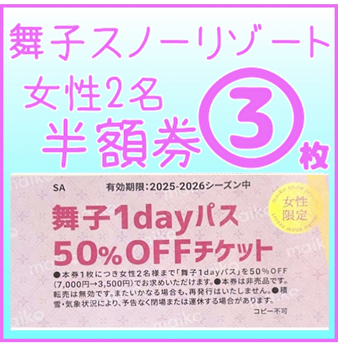 本券1枚で女性2名様まで大人リフト1日券半額
